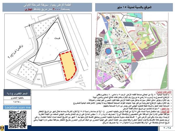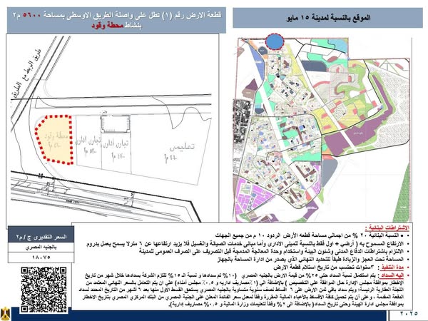 وأكد المهندس على محمد سعد على رئيس جهاز مدينة 15 مايو بأن جهاز المدينة طرح عددا من قطع الأراضي الاستثمارية وهى تضم ( قطعة الأرض رقم (6) بمنطقة النرجس بنشاط تجارى بمساحة 2995 مترا مربعا، وقطعة ارض رقم (1هـ) بمركز خدمات المنطقة الصناعية الثانية بمساحة 3594 مترا مربعا بنشاط محطة خدمة وتموين سيارات وقطعة الأرض رقم (5) مركز الحى الثانى بالامتداد بمساحة 630 مترا مربعا بنشاط تجارى، وقطعة ارض رقم (2) بمركز الحى (1-ب) بمساحة 1660 مترا مربعا بنشاط تجارى إدارى سكنى.