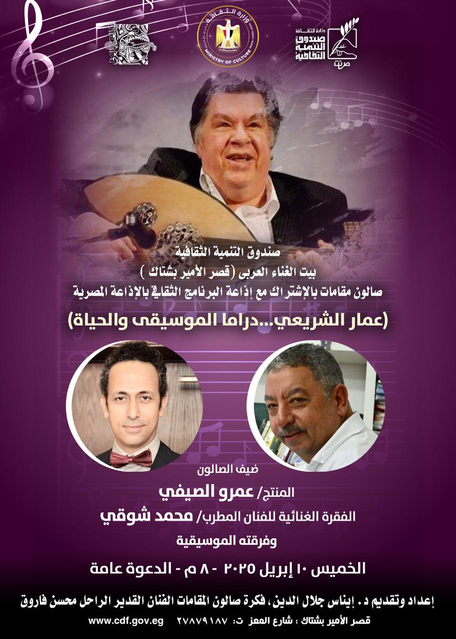 ينظم بيت الغناء العربي بقصر الأمير بشتاك- شارع المعز لدين الله الفاطمي- التابع لصندوق التنمية الثقافية- بالتعاون مع إذاعة البرنامج الثقافي بالإذاعة المصرية أمسية جديدة من أمسيات صالون “مقامات”، بعنوان “عمار الشريعي..دراما الموسيقى والحياة”، احتفاءً بمسيرة الموسيقار الكبير عمار الشريعي، وذلك في الثامنة مساء الخميس القادم الموافق 10 ابريل.