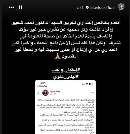 قدمت الفنانة ليلي علوى عبر حسابها على موقع التواصل الاجتماعي “إنستجرام” اعتذارا رسميا للجمهور ولأسرة الفريق أحمد شفيق، بعد نشرها خبرا عن وفاته دون التأكد منه.