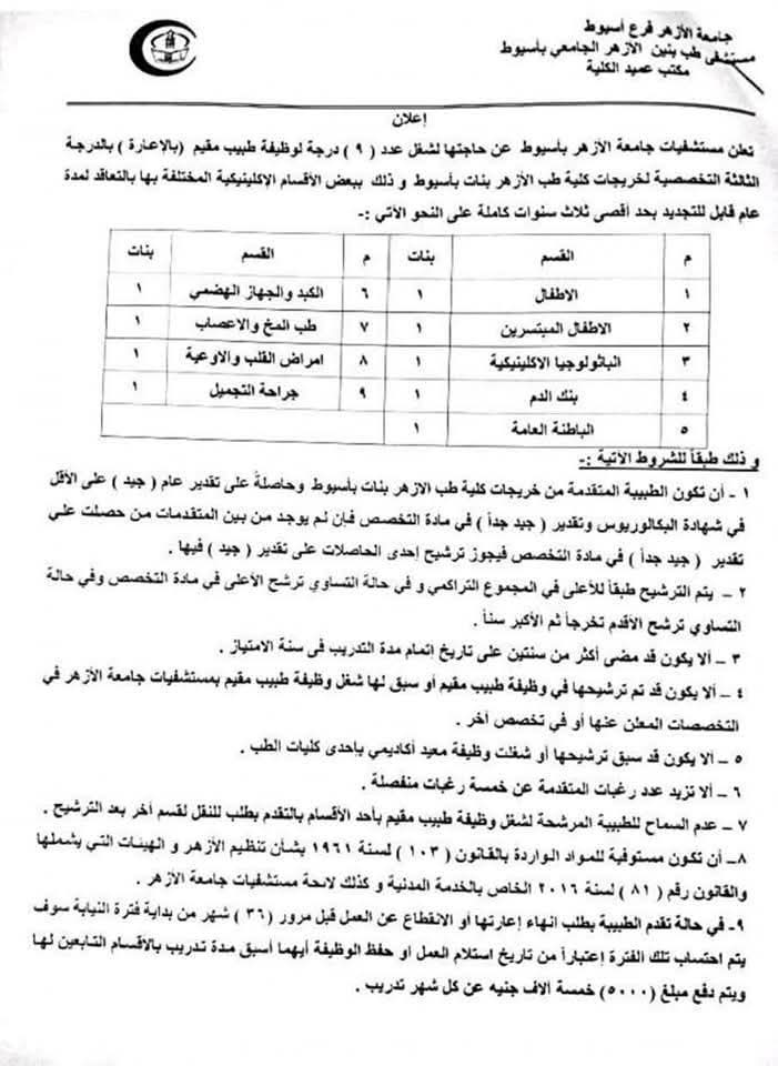أعلنت مستشفيات جامعة الأزهر بأسيوط حاجتها لشغل عدد "9" درجات لوظيفة طبيب مقيم "بالإعارة" بالدرجة الثالثة التخصصية لخريجات كلية طب الأزهر بنات بأسيوط وذلك ببعض الأقسام الإكلينيكية المختلفة بها بالتعاقد لمدة عام قابل للتجديد بحد أقصى ثلاث سنوات كاملة كالآتي: