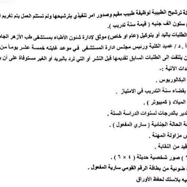 - ألا يكون قد تم ترشيحها في وظيفة طبيب مقيم أو سبق لها شغل وظيفة طبيب مقيم بمستشفيات جامعة الأزهر في التخصصات المعلنة أو في تخصص آخر.
