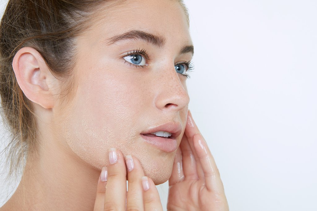 يُغسل الوجه بالماء الفاتر بلطف.