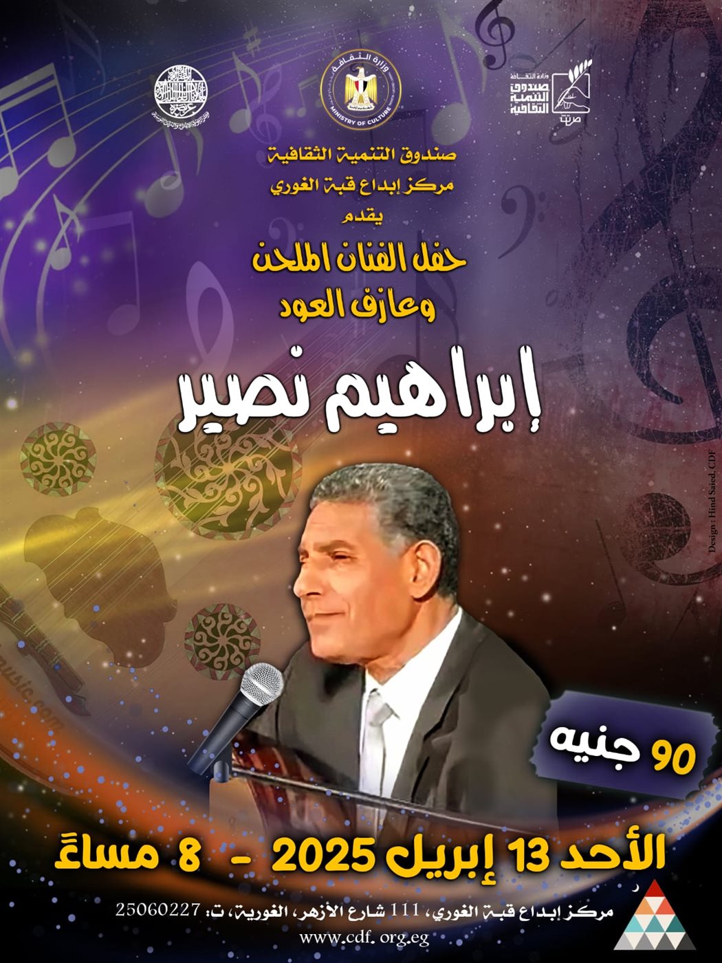 ضمن برنامج صندوق التنمية الثقافية الفني والثقافي بمراكز الابداع المتنوعة خلال شهر ابريل الجاري.. يقيم مركز إبداع قبة الغورى -بشارع الأزهر- حفلًا للملحن والمطرب وعازف العود "إبراهيم نصير" وذلك في الثامنة مساء يوم الأحد الموافق 13 إبريل.