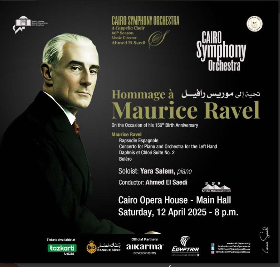 تقيم دار الأوبرا المصرية برئاسة الدكتور علاء عبد السلام حفلًا لأوركسترا القاهرة السيمفونى بقيادة المايسترو أحمد الصعيدى ومشاركة عازفة البيانو يارا سالم يحتفل خلاله بالذكرى 150 لميلاد الموسيقار الفرنسي العالمي موريس رافيل وذلك في الثامنة مساء السبت ١٢ أبريل على المسرح الكبير، وذلك ضمن فعاليات وزارة الثقافة.