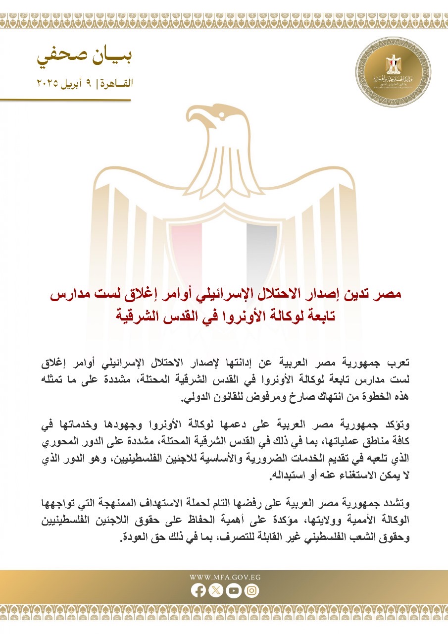 أدانت جمهورية مصر العربية، إصدار الاحتلال الإسرائيلي أوامر إغلاق لست مدارس تابعة لوكالة الأونروا في القدس الشرقية المحتلة، مشددة على ما تمثله هذه الخطوة من انتهاك صارخ ومرفوض للقانون الدولي.