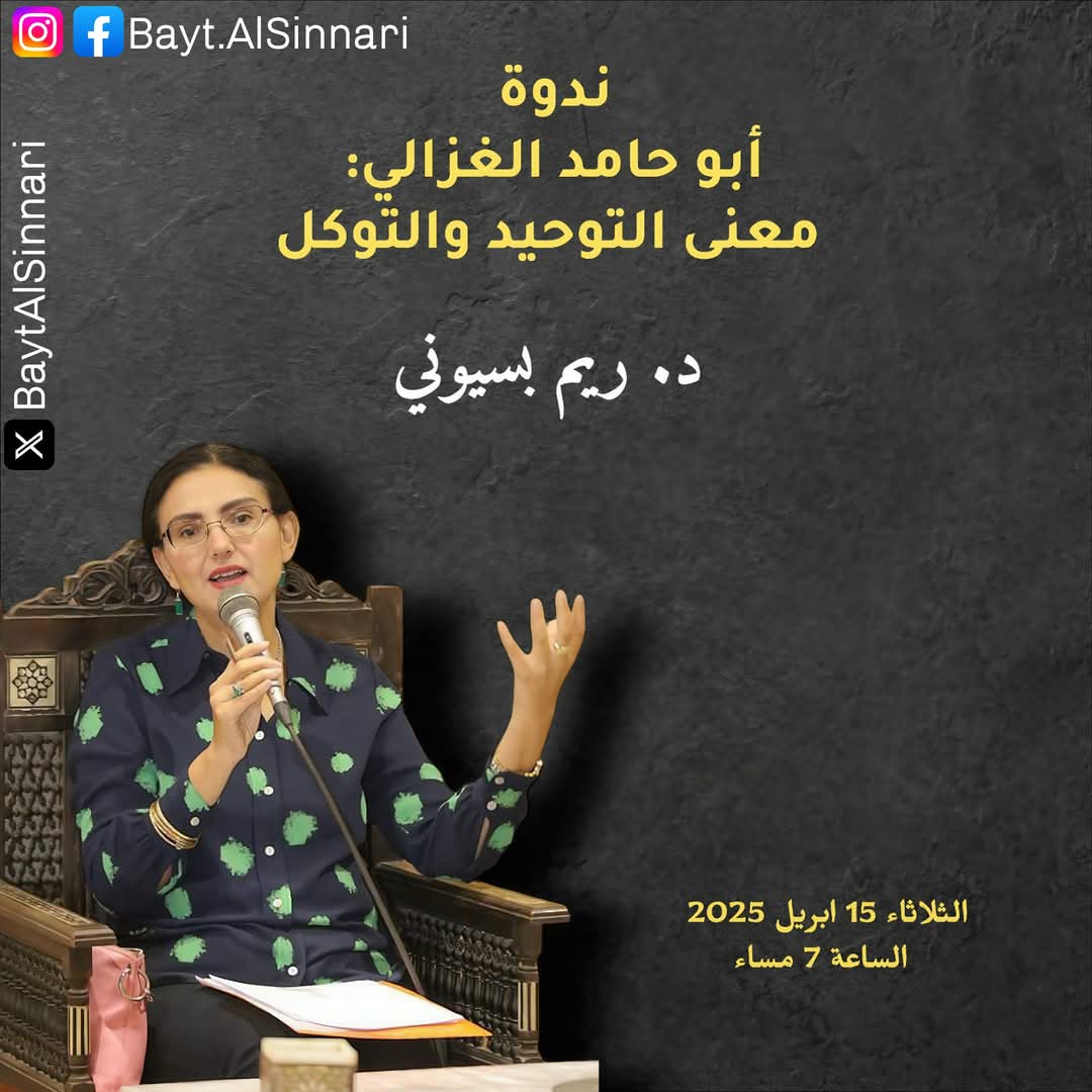 ينظم بيت السناري التابع لقطاع التواصل الثقافي بمكتبة الإسكندرية ندوة جديدة للدكتورة والكاتبة ريم بسيوني تناقش من خلالها "معنى التوحيد والتوكل" في فكر الإمام الغزالي، وذلك في يوم الثلاثاء الموافق 15 أبريل 2025، في تمام الساعة الـ 7 مساءً.