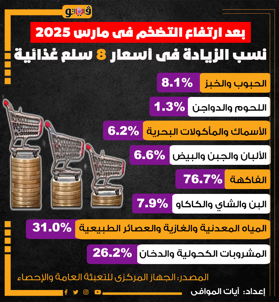 التضخم في مارس؛ أكد التقرير الشهري الصادر عن الجهاز المركزي للتعبئة والعامة والإحصاء أن الرقم القياسي العام لأسعار المستهلكين لإجمالي الجمهورية سجل (250.6) نقطة لشهر مارس 2025، مسجلًا بذلك ارتفاعا قدره (1.5%) عن شهر فبراير 2025.