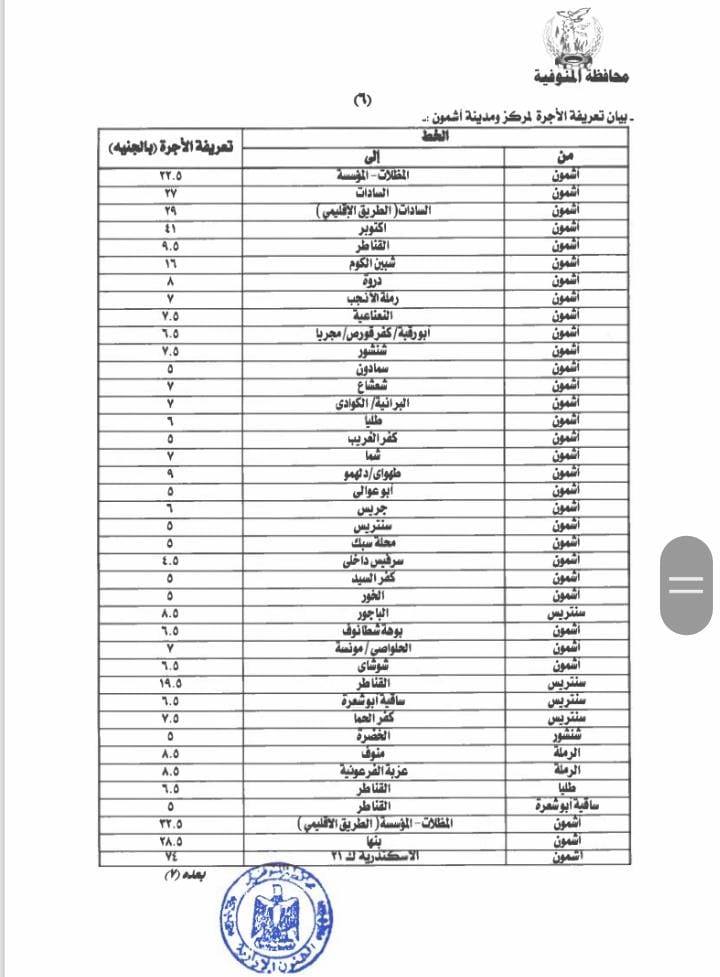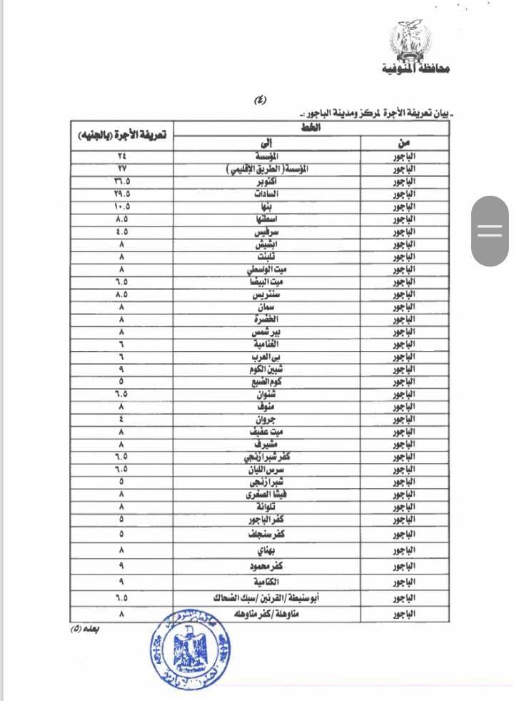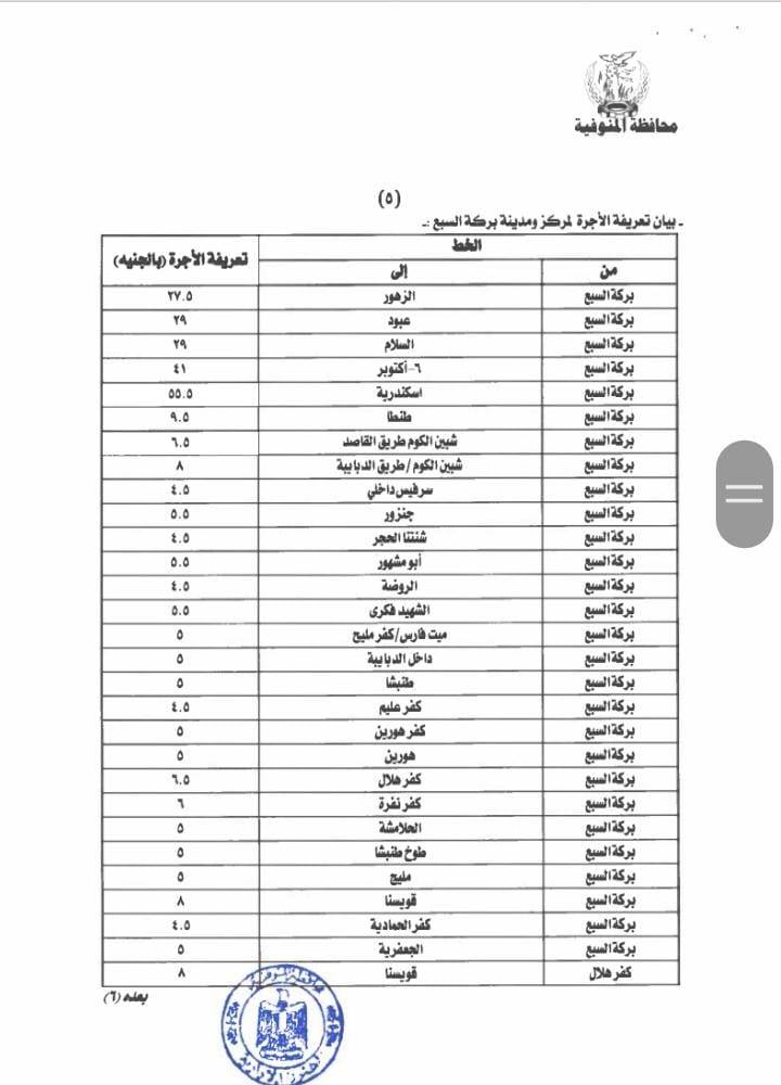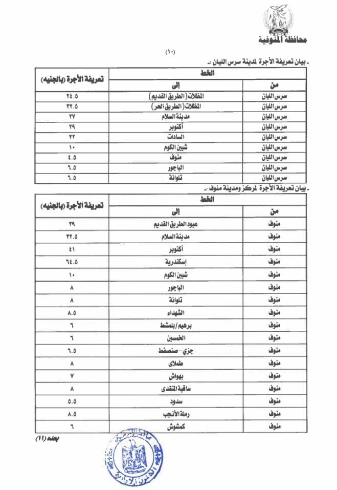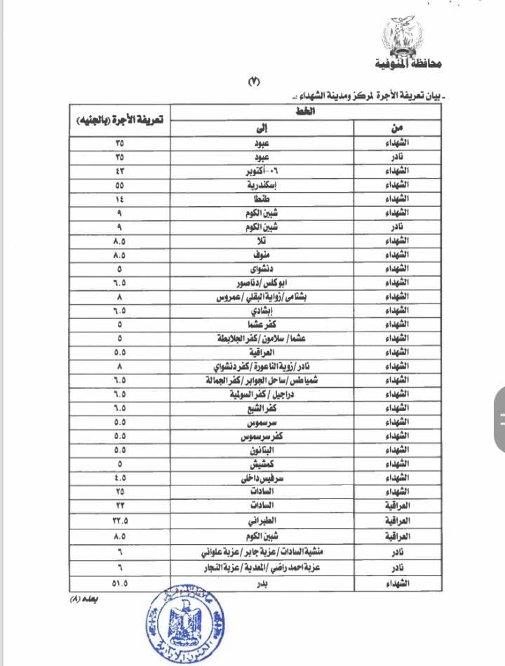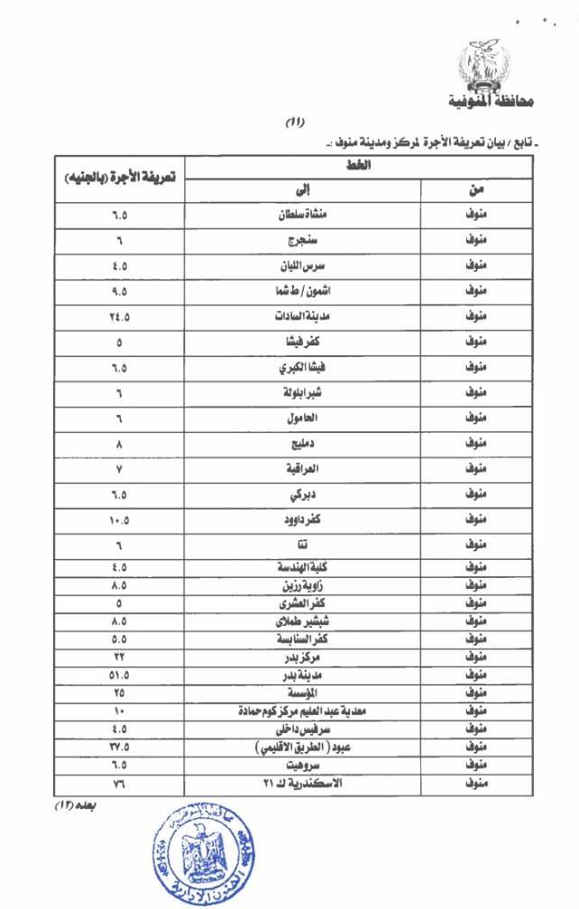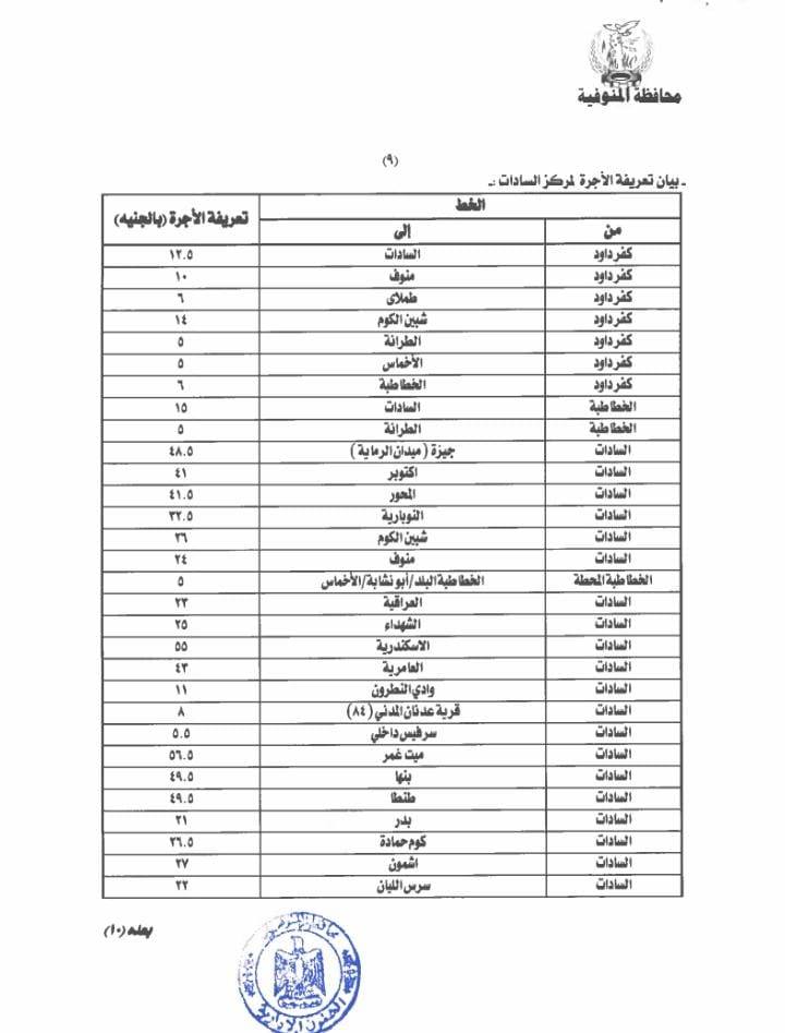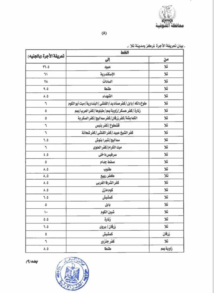 محافظ المنوفية يعتمد تعريفة الركوب الجديدة بعد زيادة البنزين والسولار