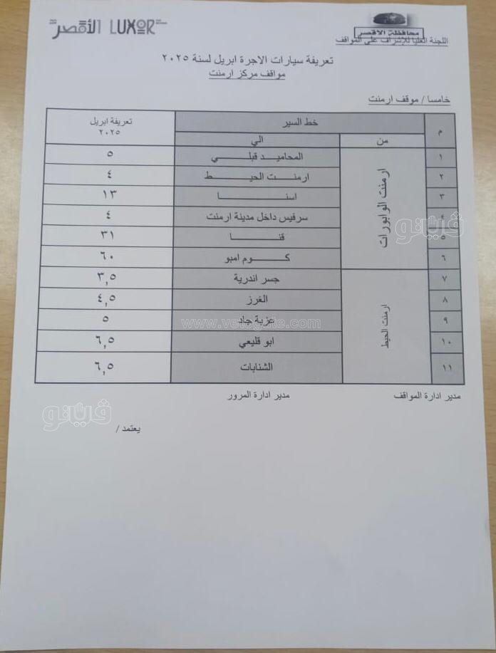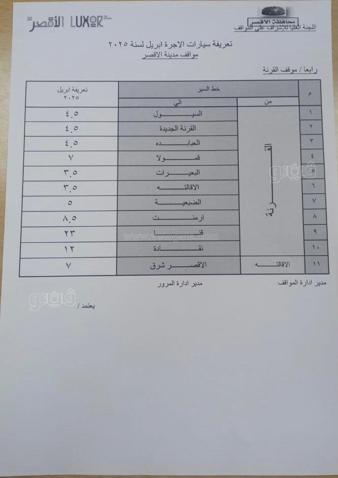 أصدر المهندس عبدالمطلب عمارة محافظ الأقصر، اليوم قرار رقم (220) لسنة 2025 الخاص بتعديل التعريفة الجديدة والمقررة لركوب سيارات الأجرة والسرفيس بدائرة المحافظة، وذلك علي إثر زيادة أسعار البنزين والسولار الذي أقرته لجنة التسعير التلقائي للمواد البترولية.