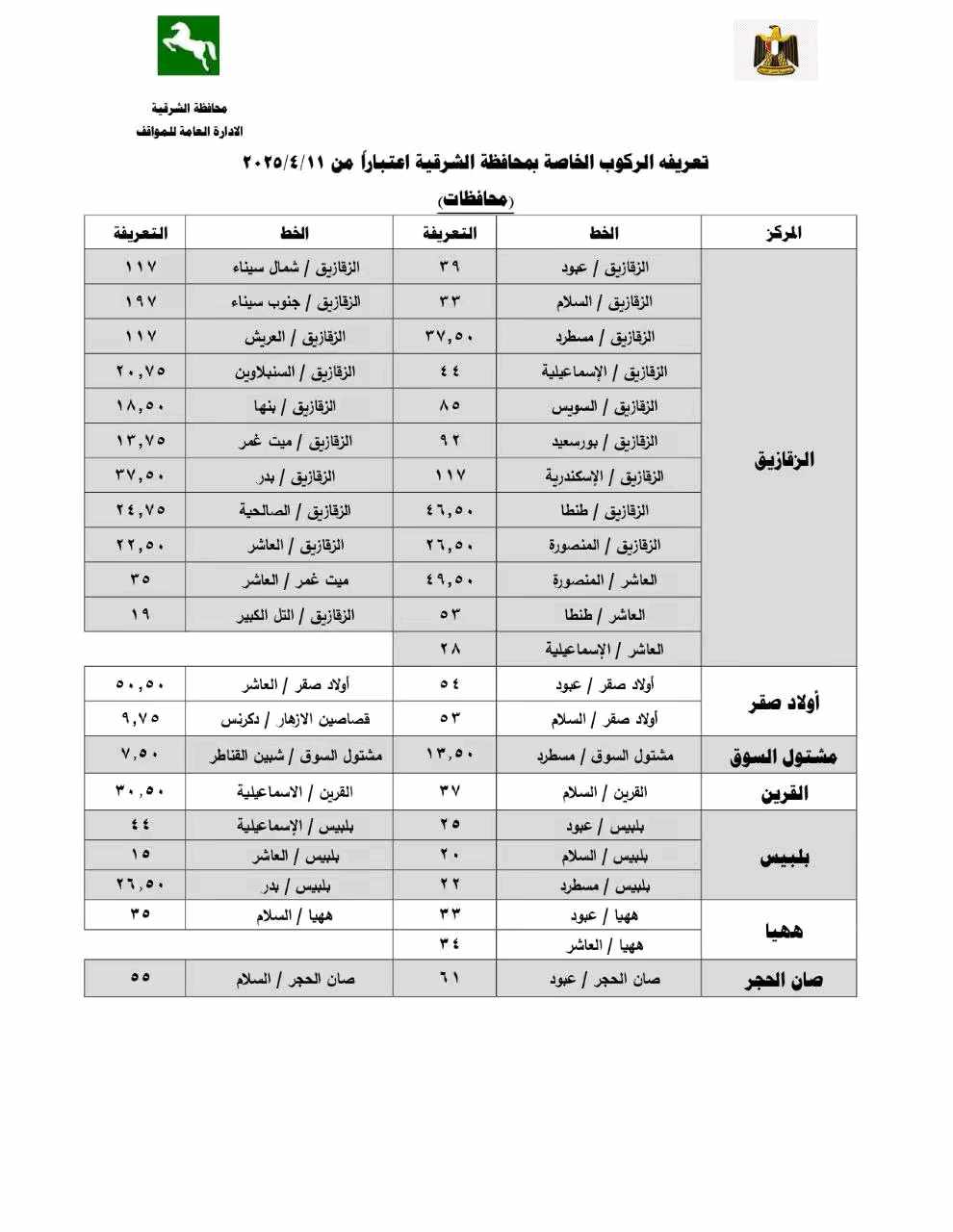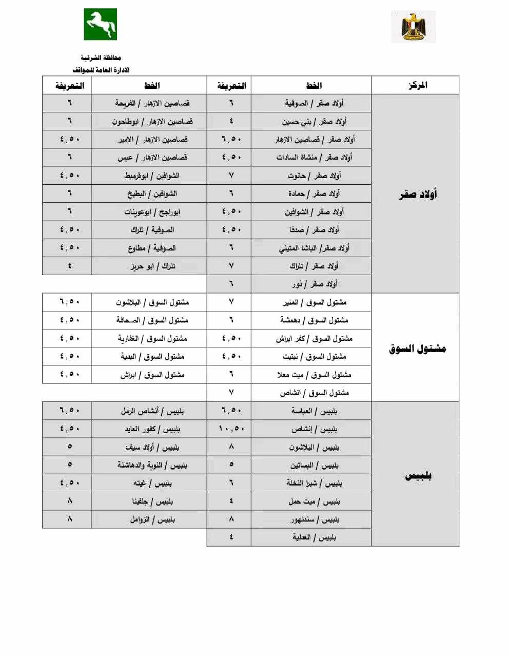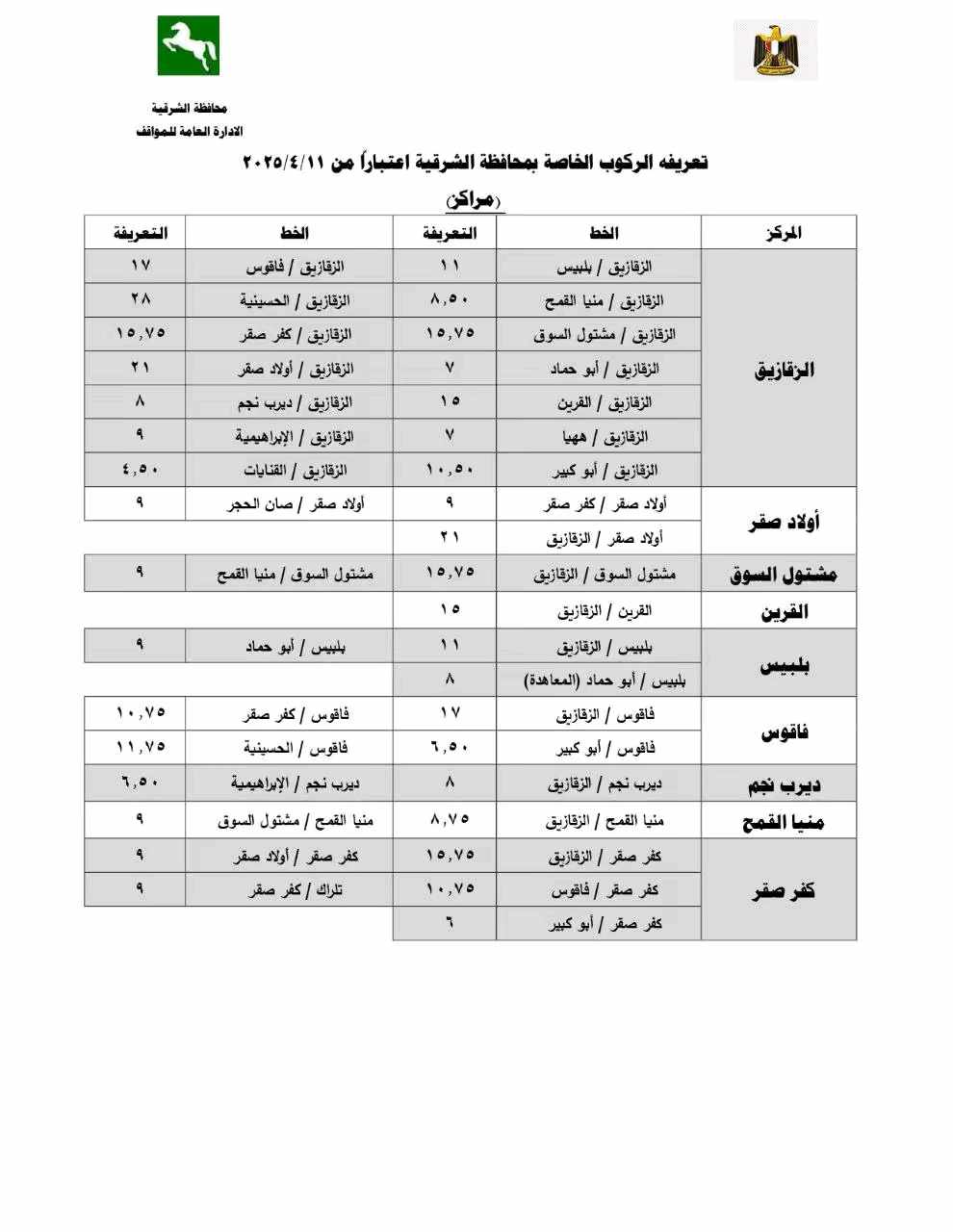 أوضح محافظ الشرقية أن قرار تعديل تعريفة الركوب جاء بما يتماشى مع مسافة كل خط سير ومراعاة للبعد الاجتماعي للمواطنين محذرًا من استغلال المواطنين في تحصيل مبالغ أزيد من تعريفة الركوب المقررة ومؤكدًا أنه سيتم إتخاذ كافة الإجراءات القانونية حيال غير الملتزمين.