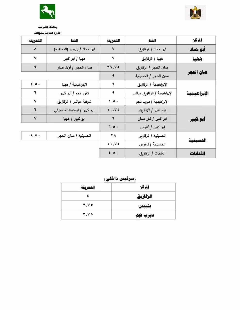 كما أصدر المحافظ قرارًا بتعديل تعريفة الركوب لسيارات التاكسي العداد بمدن المحافظة ليكون فتح البنديرة ( 11.5 جنيه ) تشمل كيلو متر واحد على أن تزداد القيمة بواقع (3) جنيها لكل كيلو متر واحد ( 9 جنيها ) لساعة الإنتظار الأولى وتزداد بواقع (8.5 جنيهات ) لكل ساعة إضافية وكذلك تعديل تسعيرة الركوب لسيارات السرفيس داخل مدينة الزقازيق لتكون 4 جنيهات.