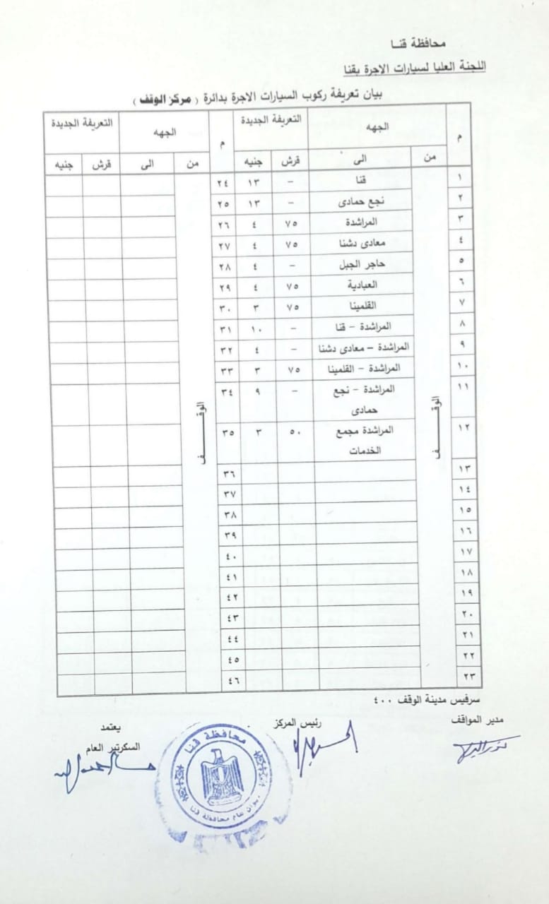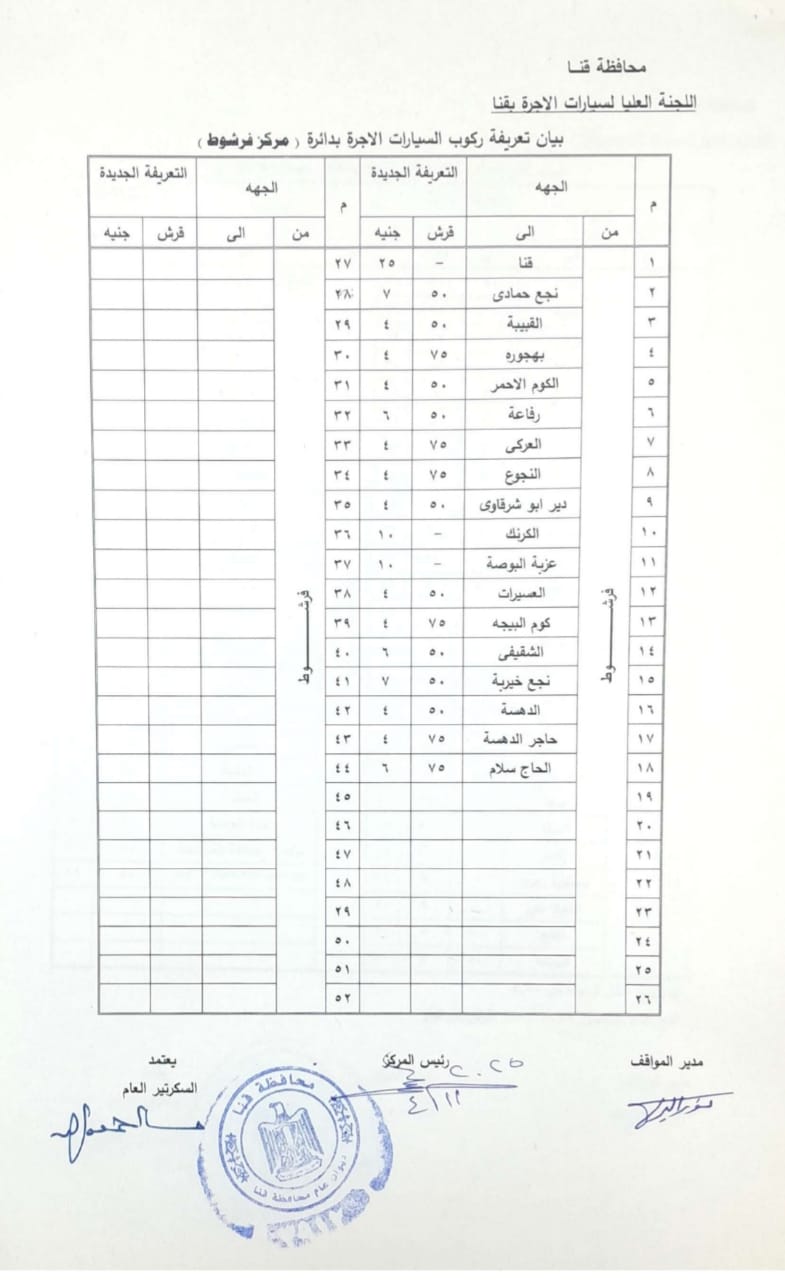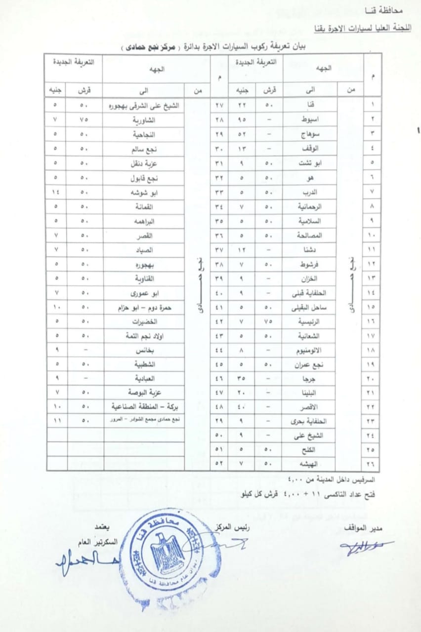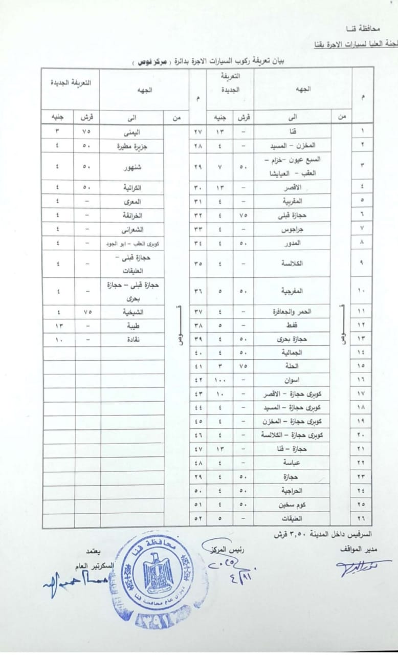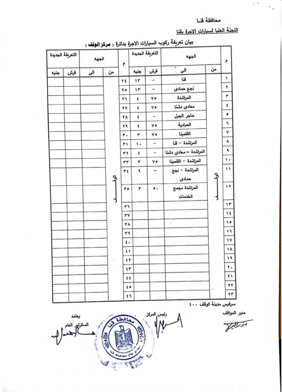 ووجه محافظ قنا، مدير عام المواقف بالإعلان عن التعريفة الجديدة في أماكن واضحة بجميع المواقف، ووضع لافتات موضحة لخطوط السير وقيمة الأجرة المقررة، إلى جانب لصق استيكرات تتضمن التعريفة وخط السير وعدد الركاب على الزجاجين الأمامي والخلفي لجميع سيارات الأجرة والسرفيس، لضمان الشفافية وتعريف المواطنين بالقيمة الرسمية للتعريفة.