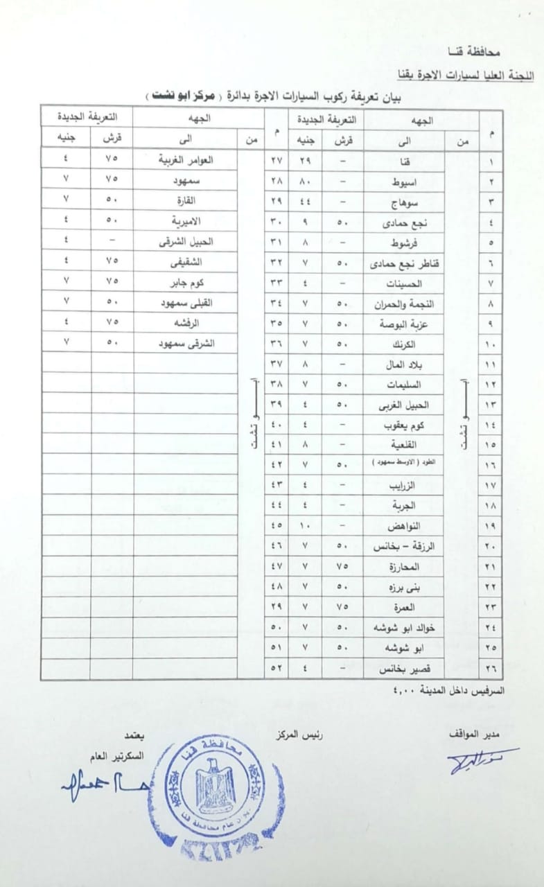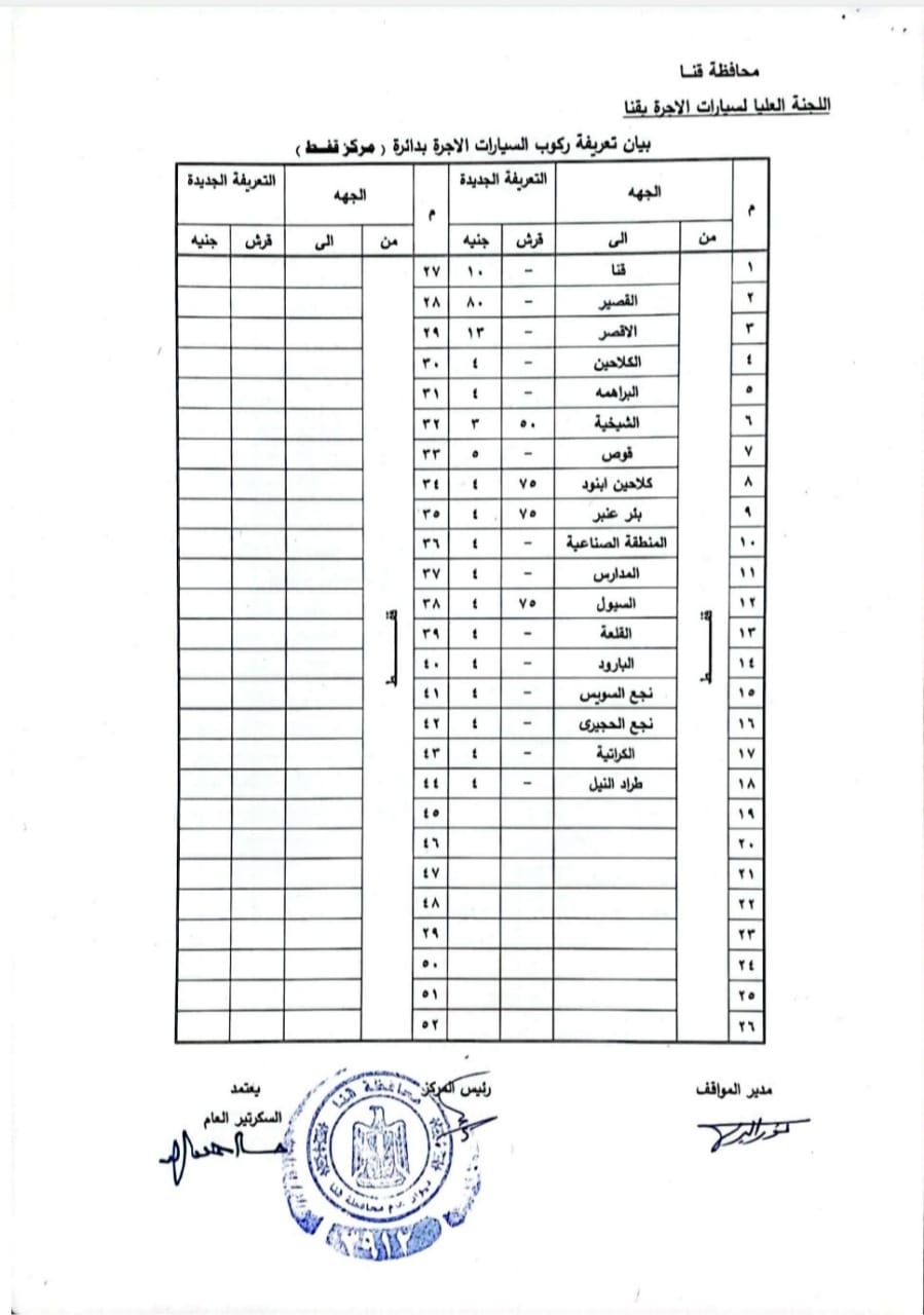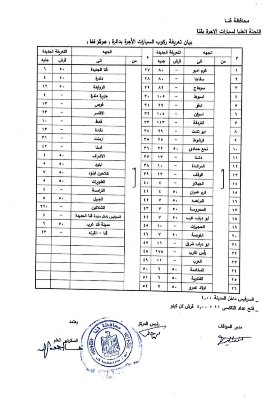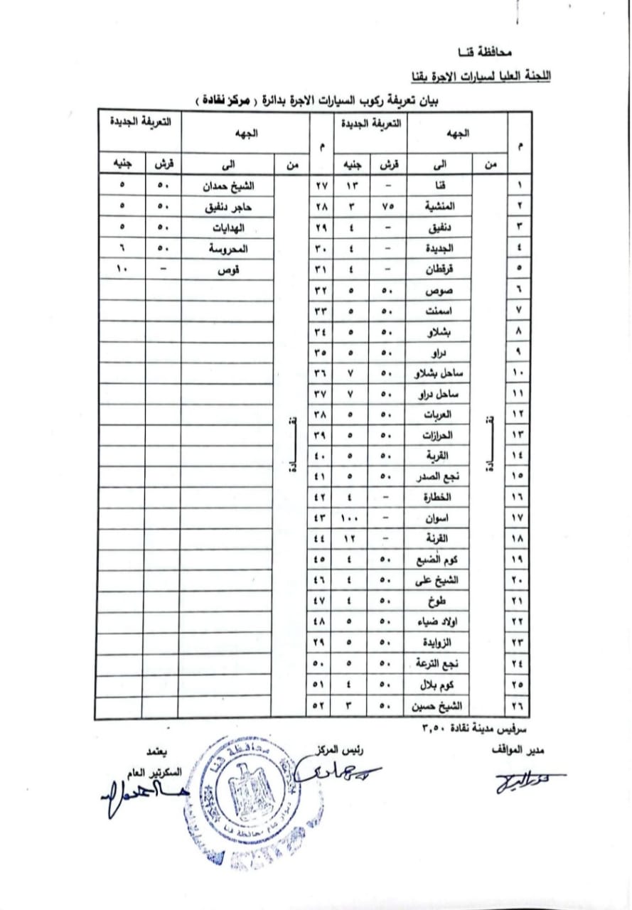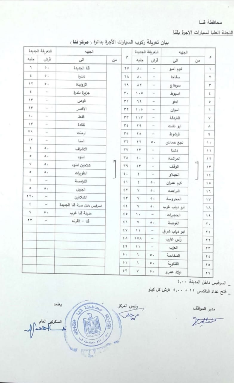ووجه محافظ قنا، مدير عام المواقف بالإعلان عن التعريفة الجديدة في أماكن واضحة بجميع المواقف، ووضع لافتات موضحة لخطوط السير وقيمة الأجرة المقررة، إلى جانب لصق استيكرات تتضمن التعريفة وخط السير وعدد الركاب على الزجاجين الأمامي والخلفي لجميع سيارات الأجرة والسرفيس، لضمان الشفافية وتعريف المواطنين بالقيمة الرسمية للتعريفة.
