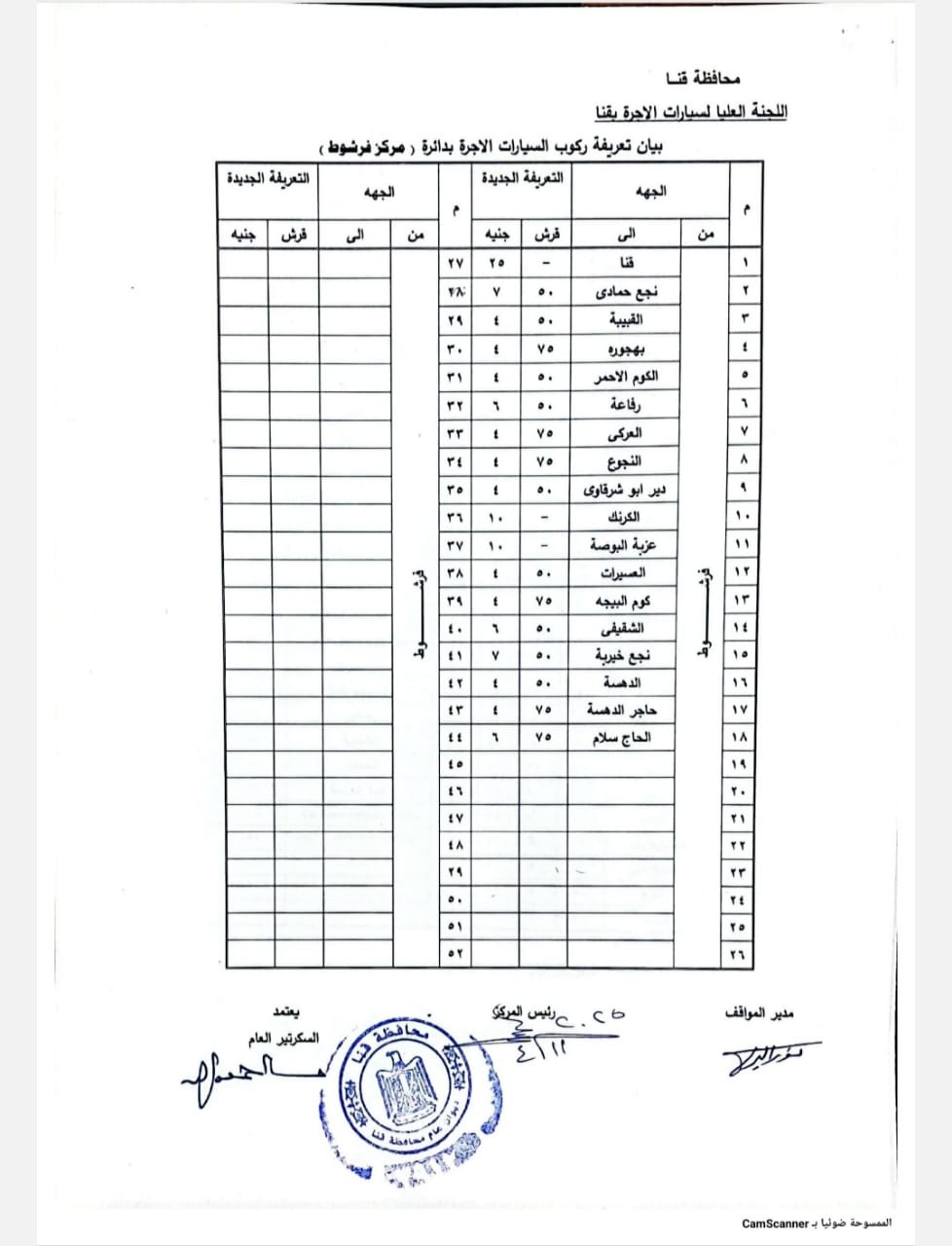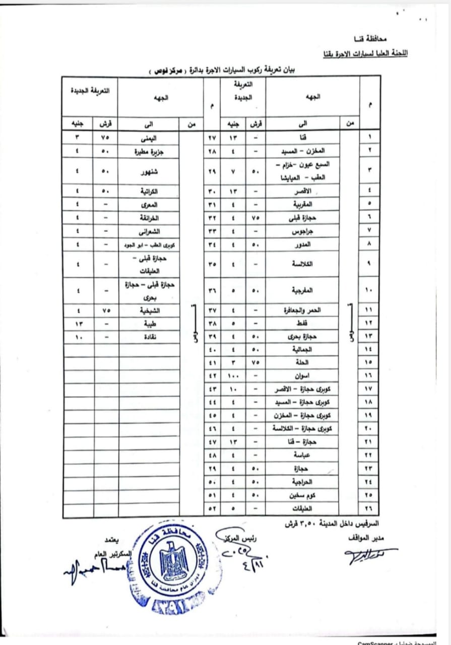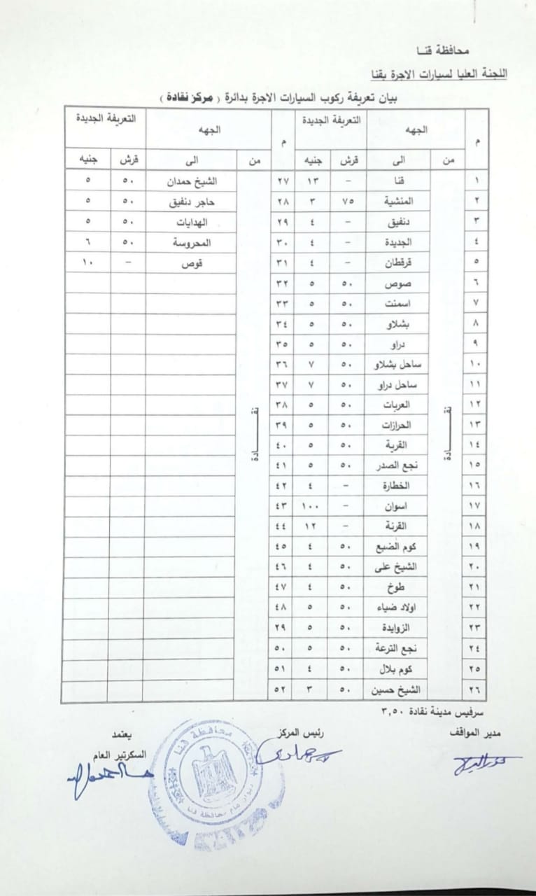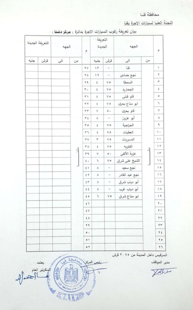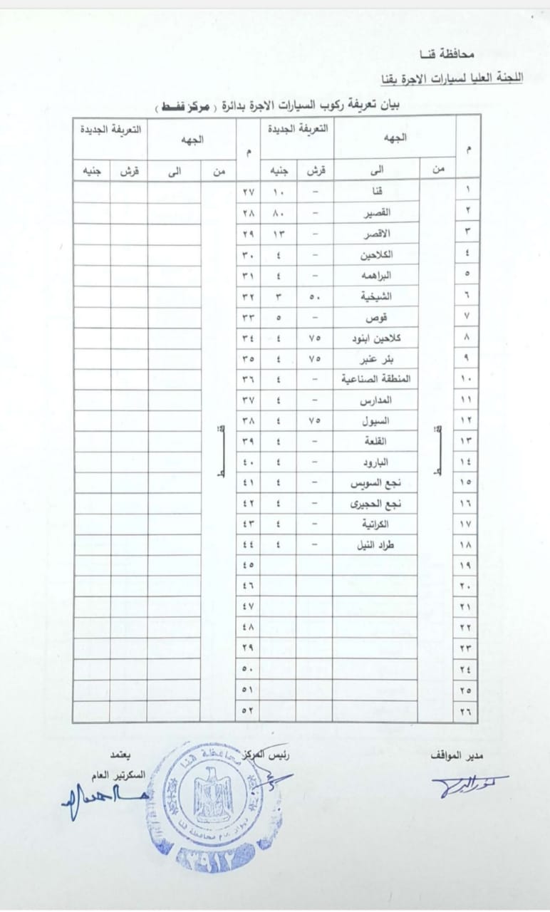 ووجه محافظ قنا، مدير عام المواقف بالإعلان عن التعريفة الجديدة في أماكن واضحة بجميع المواقف، ووضع لافتات موضحة لخطوط السير وقيمة الأجرة المقررة، إلى جانب لصق استيكرات تتضمن التعريفة وخط السير وعدد الركاب على الزجاجين الأمامي والخلفي لجميع سيارات الأجرة والسرفيس، لضمان الشفافية وتعريف المواطنين بالقيمة الرسمية للتعريفة.