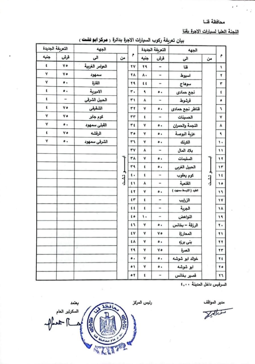 ومن جانبه أكد الدكتور خالد عبدالحليم، محافظ قنا، أنه فور إعلان أسعار الوقود الجديدة، تم تكليف لجنة تحديد تعريفة المواصلات بعقد اجتماع عاجل لتحديث تعريفة الركوب بما يتناسب مع الزيادة الجديدة، مع مراعاة مسافة كل خط وعدد الرحلات، تحقيقًا للعدالة بين المواطنين والسائقين، مشيرًا إلى التنسيق الكامل مع المحافظات المجاورة لتوحيد التعريفة على الخطوط المشتركة.