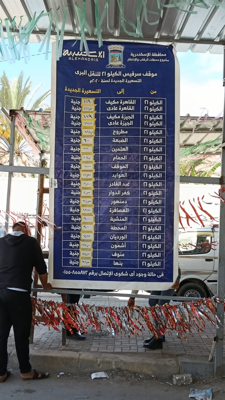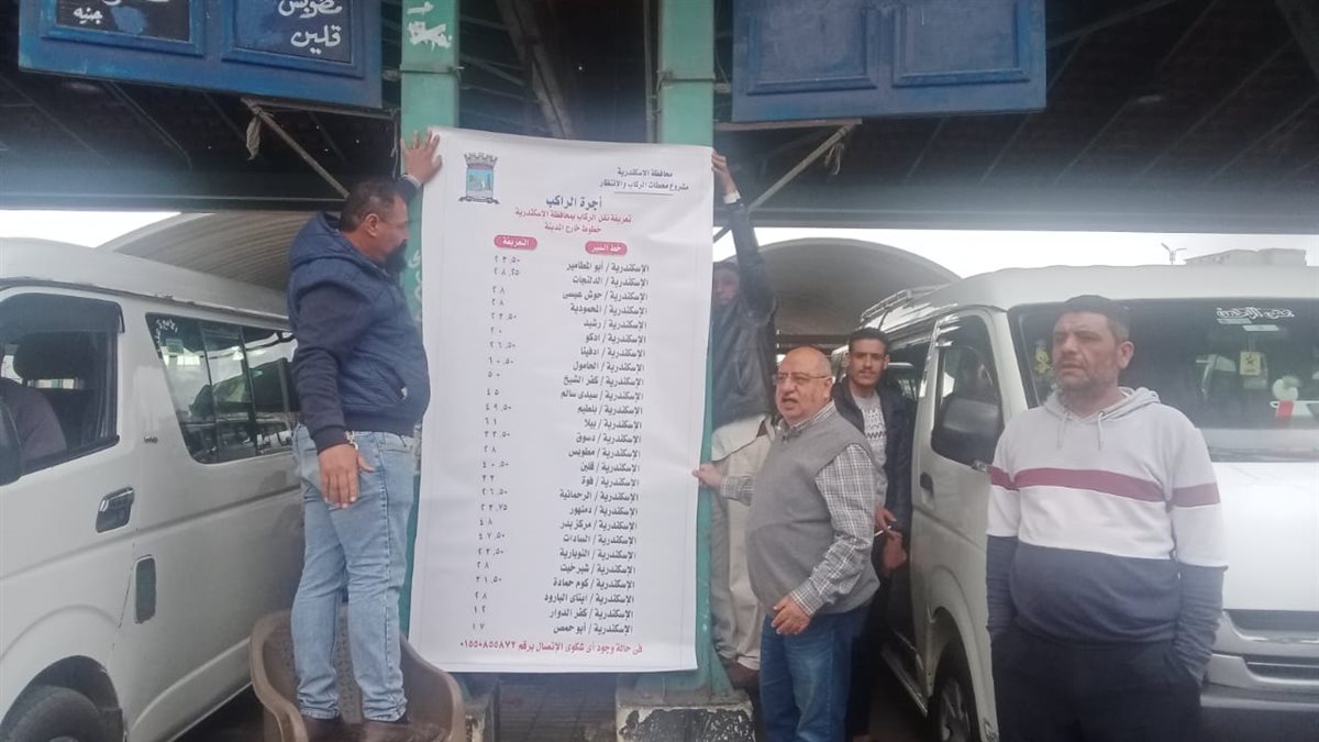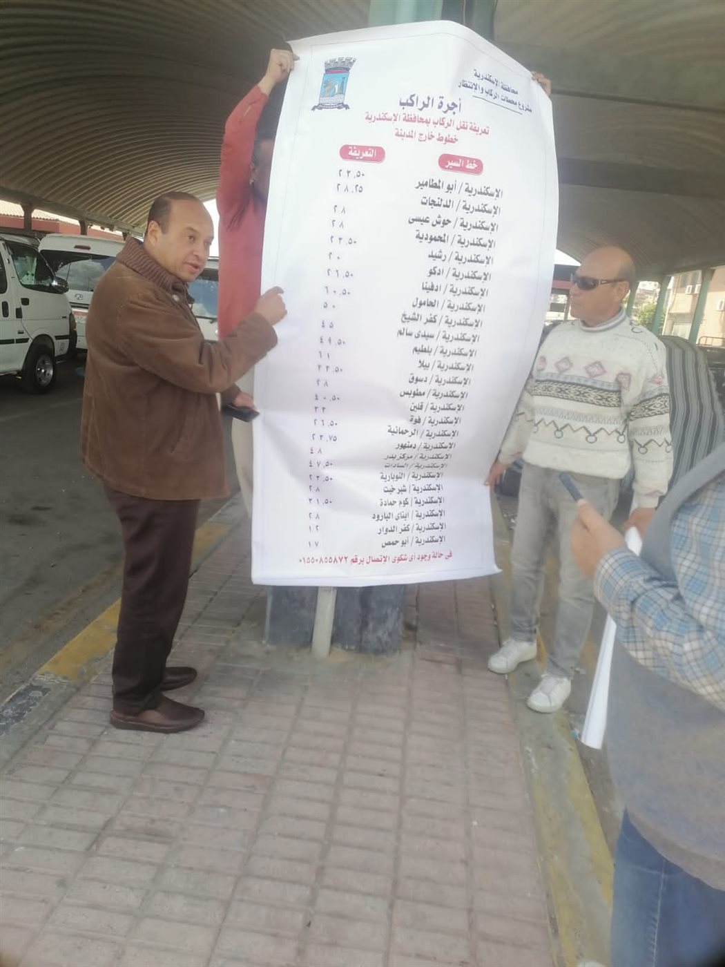 وتنفيذًا لتوجيهات محافظ الإسكندرية بهذا الشأن قامت إدارة المواقف منذ اعتماد تسعيرة الركوب الجديدة بوضع بنرات توضح خطوط السير وسعر تعريفة الركوب في كل خط وذلك المواقف الرئيسية بنطاق المحافظة وهي (موقف ميدان الشهداء "بمحطة مصر- موقف الكيلو ٢١- موقف العوايد- موقف العامرية- موقف بسيون أبو سليمان- موقف المنشية- الموقف الجديد).