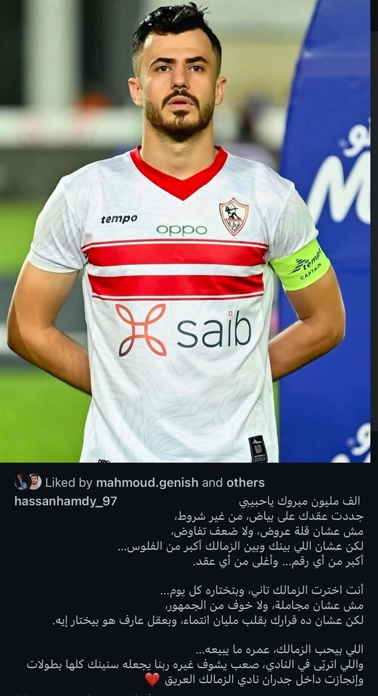 وأكمل: “أنت اخترت الزمالك تاني، وبتختاره كل يوم، مش عشان مجاملة، ولا خوف من الجمهور، لكن عشان ده قرارك بقلب مليان انتماء، وبعقل عارف هو بيختار إيه، اللي بيحب الزمالك، عمره ما يبيعه”.