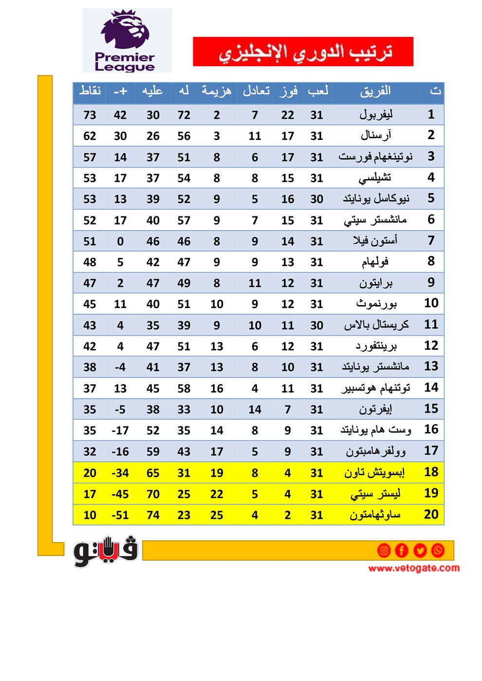 ترتيب فرق الدوري الإنجليزي قبل انطلاق الجولة الـ 32