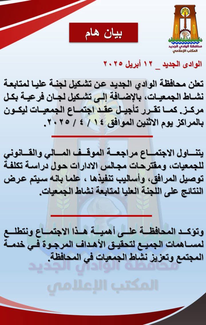 أعلنت محافظة الوادي الجديد تشكيل لجنة عليا لمتابعة نشاط الجمعيات، بالإضافة إلى تشكيل لجان فرعية بكل مركز كما تقرر تأجيل عقد اجتماع الجمعيات ليكون بالمراكز يوم الإثنين الموافق ١٤ / ٤ / ٢٠٢٥.