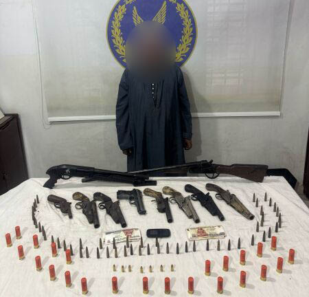 وعقب تقنين الإجراءات القانونية، تم ضبط المتهم وبحوزته كميات من الأسلحة النارية والذخائر غير المرخصة، حيث تم العثور على 2 بندقية خرطوش، طبنجة، 7 فرد محلي وعدد من الطلقات مختلفة الأعيرة.