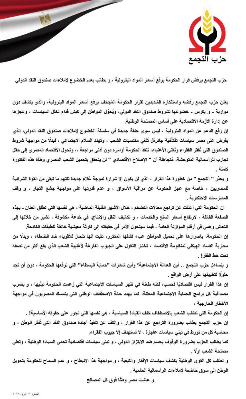 وطالب حزب التجمع بضرورة التراجع عن هذا القرار، والكف عن تنفيذ أجندة صندوق النقد التي تُفقر الوطن، ومحاسبة كل من تورط في تبني سياسات عاجزة، لا تستهدف إلا جيوب الفقراء.
