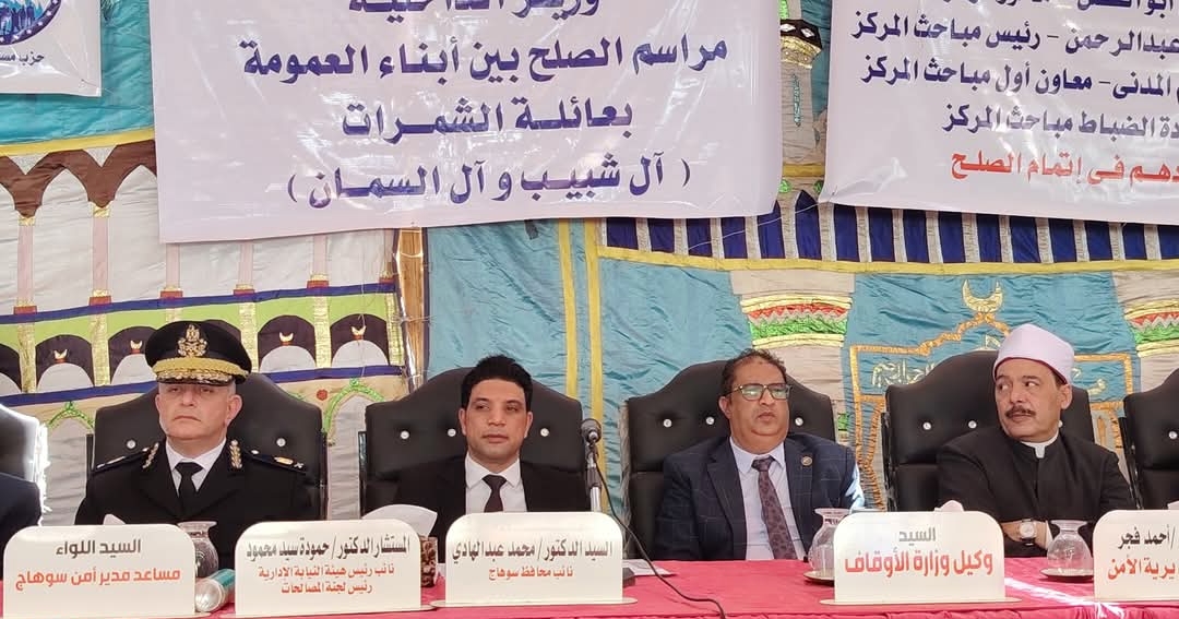 شهدت قرية عرابة أبو الدهب بمركز سوهاج جلسة صلح بين عائلتي آل شبيب وآل السمان فى أجواء يسودها الود والتسامح بين العائلتين بحضور الدكتور محمد عبدالهادى نائب المحافظ.