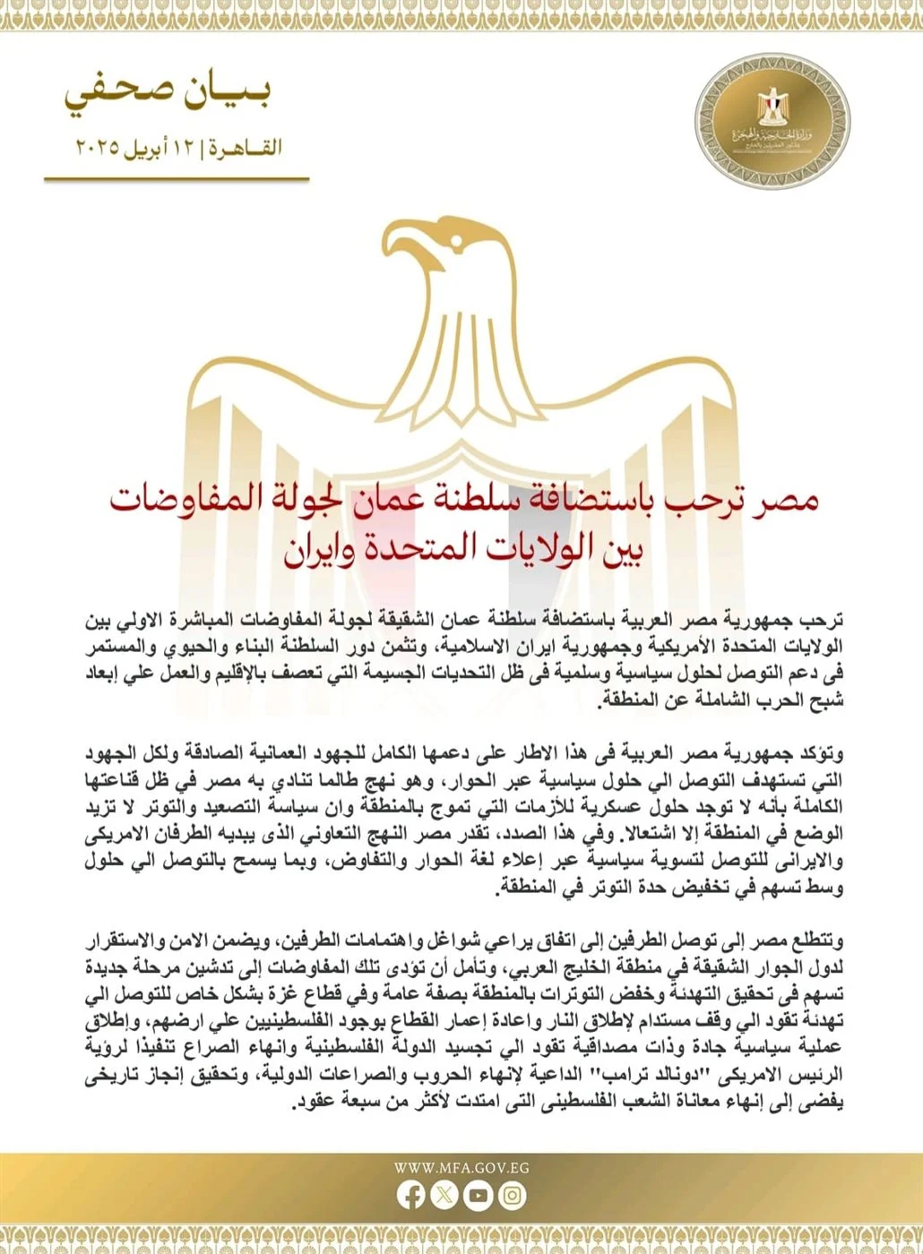 رحبت مصر باستضافة سلطنة عمان الشقيقة لجولة المفاوضات المباشرة الأولى بين الولايات المتحدة الأمريكية وجمهورية إيران الإسلامية.