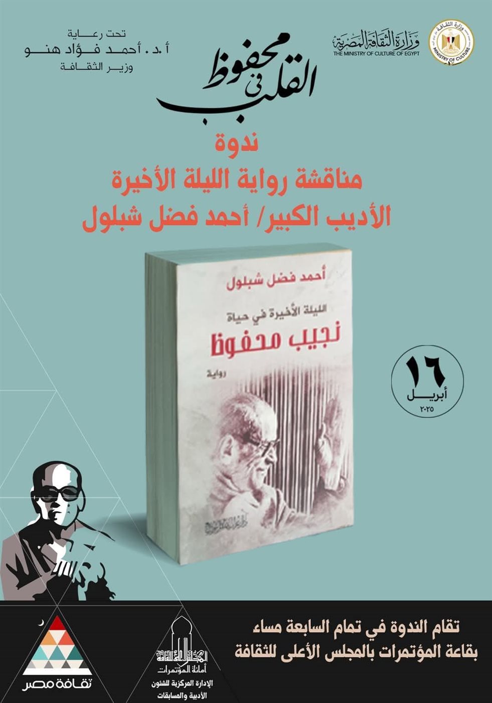 يُنظم المجلس الأعلى للثقافة بمناسبة احتفالية " محفوظ فى القلب “..لعزة الهوية المصرية ” ندوة لإحدى أعمال الأديب الكبير أحمد فضل شبلول رواية بعنوان " الليلة الأخيرة في حيـاة محفوظ " احتفاءً بإسهامات الكاتب الكبير نجيب محفوظ في تعزيز الهوية المصرية،وذلك الأربعاء الموافق ١٦ ابريل الساع السابعة مساءً.