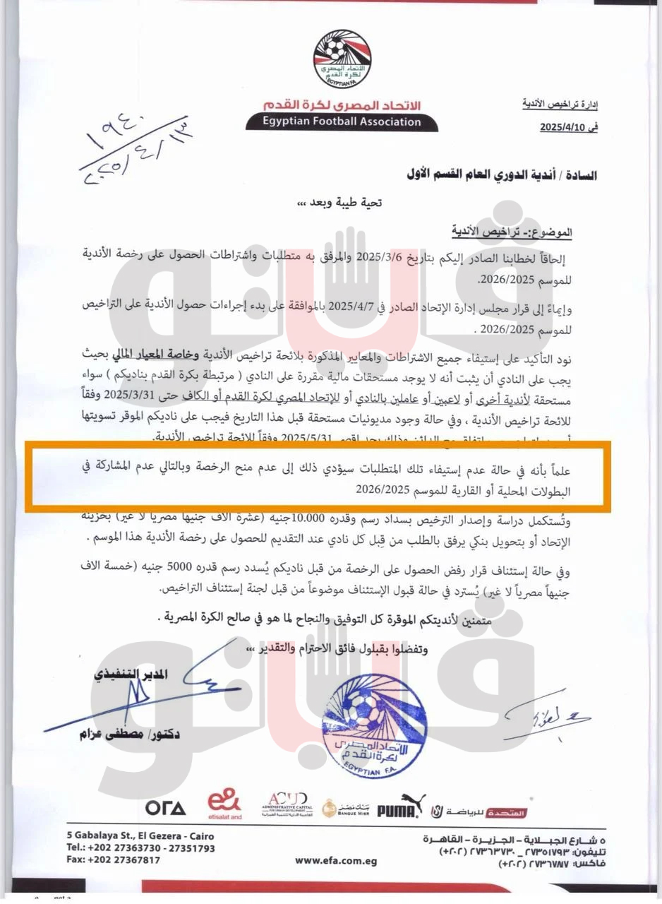 وجاء في الخطاب أنه “تستكمل دراسة وإصدار الترخيص بسداد رسم وقدره 10 آلاف جنيه مصري، بخزينة اتحاد الكرة أو تحويل بنكي يرفق بالطلب من قبل كل نادٍ عند التقديم للحصول على رخصة الأندية هذا الموسم”.