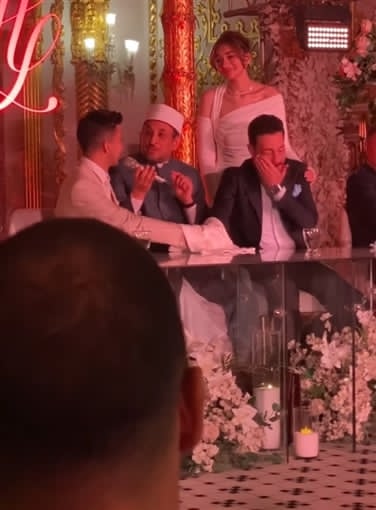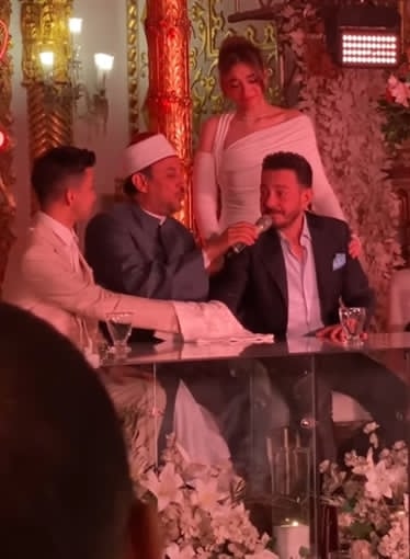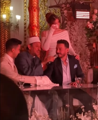 وظهر الفنان أحمد زاهر، وهو يمسح دموع عينيه بيده، وكذلك ابنته ملك أحمد زاهر، وشهد على عقد القران رئيس النادي الأهلي محمود الخطيب.