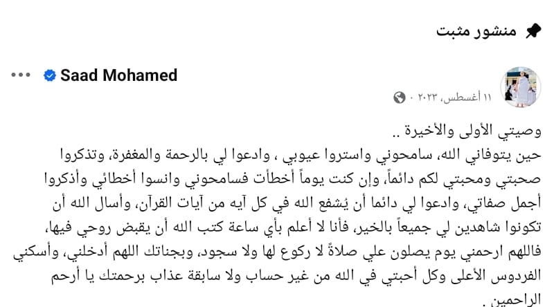 وكتب سعد محمد في وصيته: وصيتي الأولى والأخيرة، حين يتوفاني الله، سامحوني واستروا عيوبي، وادعوا لي بالرحمة والمغفرة، وتذكروا صحبتي ومحبتي لكم دائما، وإن كنت يوما أخطأت فسامحوني، وانسوا أخطائي وأذكروا أجمل صفاتي، وادعوا لي دائما أن يُشفع الله في كل آيه من آيات القرآن، وأسال الله أن تكونوا شاهدين لي جميعًا بالخير، فأنا لا أعلم بأي ساعة كتب الله أن يقبض روحي فيها، فاللهم ارحمني يوم يصلون علي صلاةً لا ركوع لها ولا سجود، وبجناتك اللهم أدخلني، وأسكني الفردوس الأعلى وكل أحبتي في الله من غير حساب ولا سابقة عذاب برحمتك يا أرحم الراحمين.
