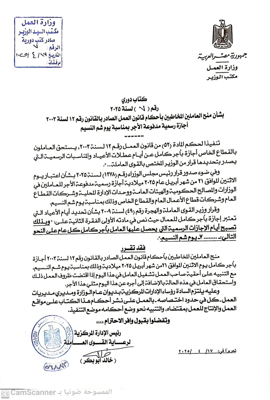 وأصدرت "الوزارة"، اليوم كتابين دوريين رقم 7 و8 لسنة 2025، بشأن منح العاملين المخاطبين بأحكام قانون العمل الصادر بالقانون رقم 12 لسنة 2003، إجازة رسمية مدفوعة الأجر بمناسبة عيد شم النسيم، وعيد تحرير سيناء، وعليه يلتزم رؤساء الإدارات المركزية بديوان الوزارة، ومديري مديريات العمل - كلٌ في حدود اختصاصه - بالعمل على نشر أحكام هذا "الكتاب" في مواقع العمل والإنتاج للعمل بمقتضاه، والتنبيه نحو وضع أحكامه موضع التنفيذ.