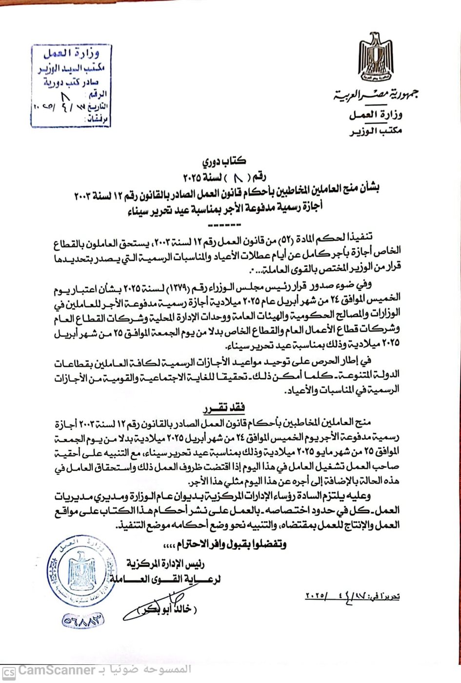 إجازة مدفوعة الأجر للعاملين بالقطاع الخاص بمناسبة شم النسيم وعيد تحرير سيناء