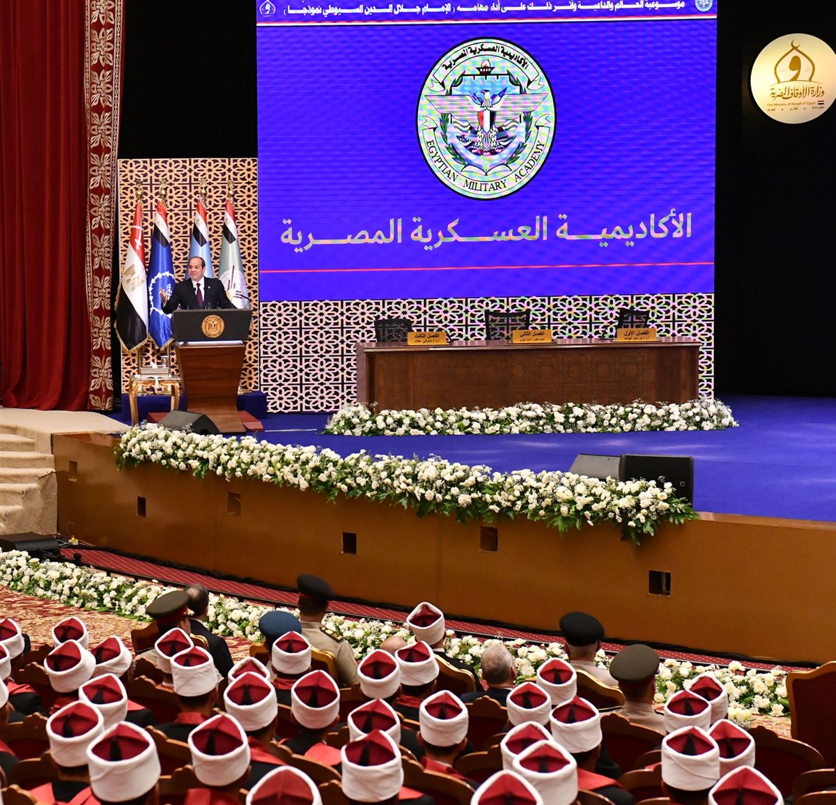 السيسي يشارك في حفل تخرج الدورة الثانية لتأهيل أئمة الأوقاف من الأكاديمية العسكرية.. يؤكد أن مهمة تجديد الخطاب الديني في تصحيح المفاهيم المغلوطة وتقديم صورة مشرقة للدين الحنيف