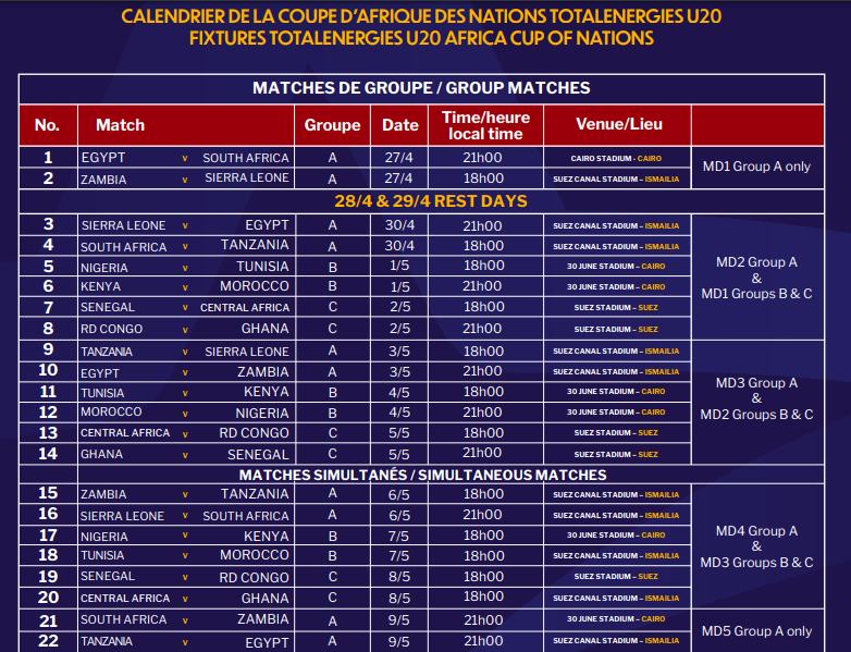 وحصلت فيتو على الجدول الكامل لمواعيد جميع مباريات بطولة أمم أفريقيا تحت 20 سنة، والتي تشهد مباراتين في اليوم الأول لانطلاق المنافسات.