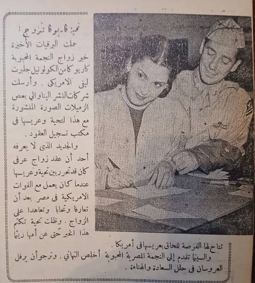 وتزوجت الفنانة والراقصة تحية كاريوكا من الضابط الأمريكي الكولونيل جلبرت ليفي، في البداية تزوجت تحية عرفيا خلال فترة خدمته في مصر، وبعدها تم إعلان الخبر، ولكن الزيجة انتهت بالطلاق بعد فترة قصيرة.
