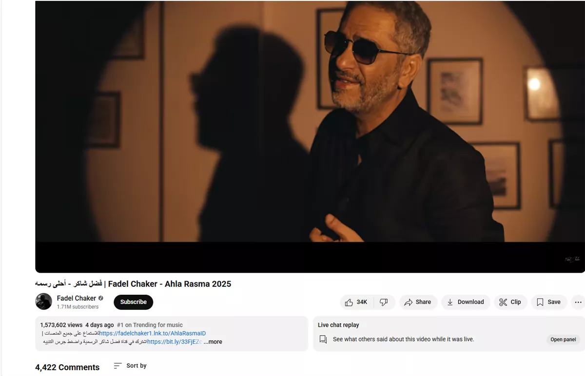 تصدر الفنان اللبناني فضل شاكر في تصدر قائمة المحتوى الرائج موسيقيًا على موقع "يوتيوب" على مستوى العالم، بأحدث أعماله الغنائية "أحلى رسمة"، والتي حجزت لنفسها المركز الأول في الترند العالمي، محققة أكثر من مليون ونصف مشاهدة خلال أربعة أيام فقط، ما يعكس تفاعلًا جماهيريًا واسعًا وإعجابًا لافتًا بإحساسه الفريد.