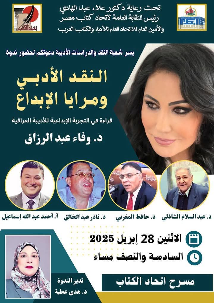وتستضيف شعبة النقد الأديبة العراقية الدكتورة وفاء عبد الرزاق رئيس المنظمة العالمية للإبداع من أجل السلام، ليشارك في قراءة تجربتها الإبداعية الدكتور عبد السلام الشاذلي والدكتور حافظ المغربي والدكتور نادر عبد الخالق والكاتب أحمد عبد الله إسماعيل.