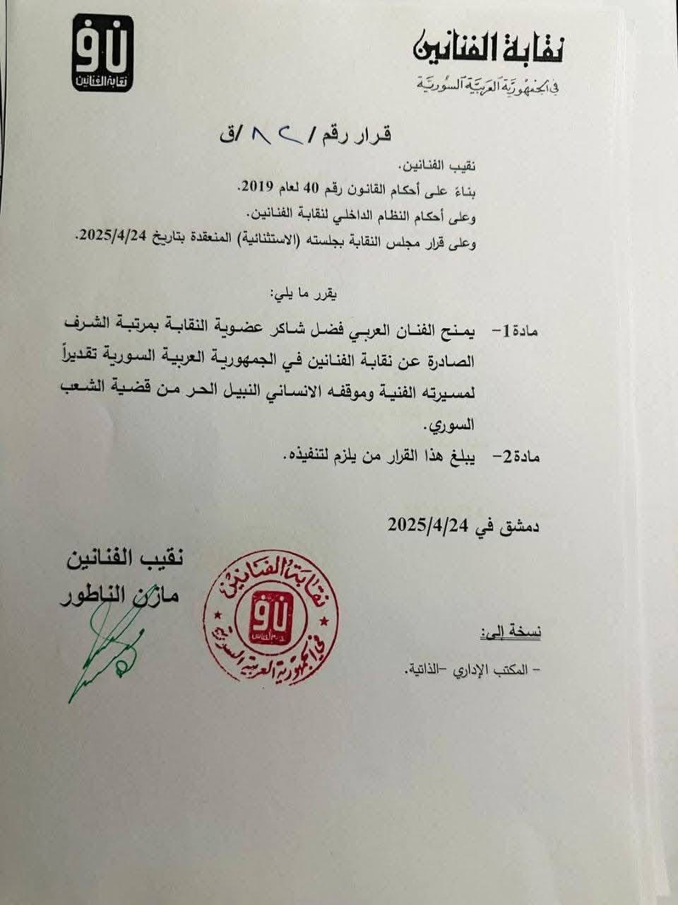 أعلنت نقابة الفنانين في سوريا منح الفنان اللبناني فضل شاكر عضوية النقابة مع مرتبة الشرف تقديرا لمسيرته الفنية ومساندته قضية الشعب السوري.