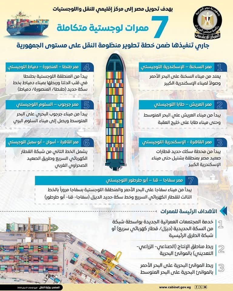 وجاء بالتقرير الذي نشرته وزارة النقل بالتخطيط لإنشاء 7 ممرات لوجستية متكاملة تنفيذا لتوجيهات فخامة الرئيس عبدالفتاح السيسي رئيس الجمهورية بتحويل مصر إلى مركز إقليمي للنقل واللوجستيات وتجارة الترانزيت ومن أهمها الممر اللوجيستي طابا-العريش، وذلك بهدف المساهمة في تنمية شبه جزيرة سيناء وربط مناطق الإنتاج (الصناعي - الزراعي) بالموانئ البحرية وربط الموانئ البحرية على البحر الأحمر بالموانئ البحرية على البحر المتوسط بواسطة شبكة من السكك الحديدية (ديزل) أو شبكة الطرق الرئيسية مرورا بالموانئ الجافة والمناطق اللوجستية الواقعة على هذه الممرات، ومن أهم عناصره إعادة تأهيل وتطوير وإنشاء خط «الفردان / شرق بورسعيد / بئر العبد / العريش / طابا» والموانئ الجافة والمناطق اللوجيستية (القنطرة -بئر العبد-العريش-بغداد - الحسنة-النقب -طابا) والمناطق الصناعية (شرق بورسعيد-بئر العبد-المساعيد -وسط سيناء-أبو زنيمة وميناء طابا البحري).