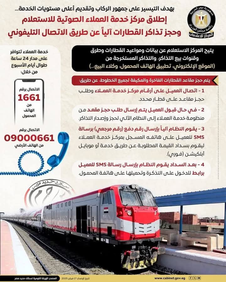 واكدت وزارة النقل أنه تم اطلاق العمل بمركز خدمة العملاء الصوتية للاستعلام وحجز تذاكر القطارات آليا عن طريق الاتصال التليفوني خلال الفترة الماضية تيسيرا على ركاب القطارات وتقديم مستوى خدمة متميز