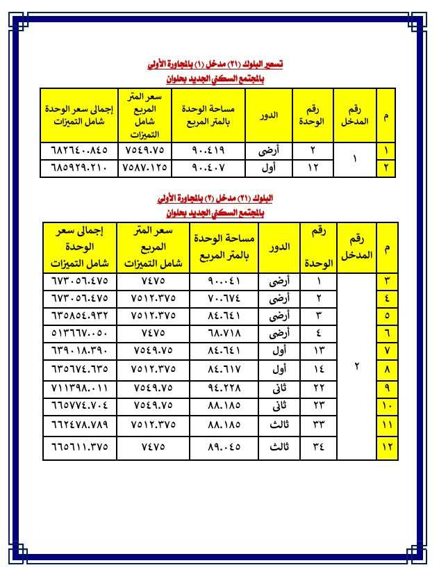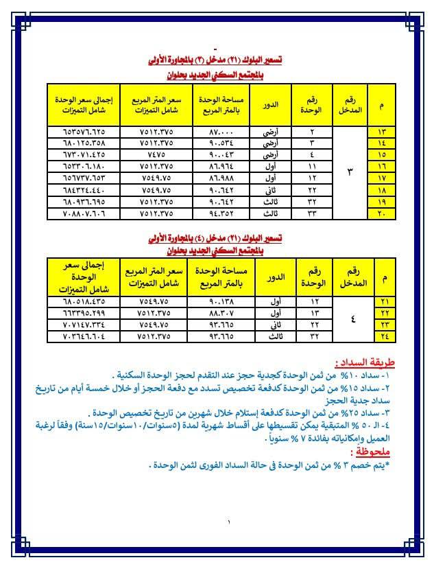 أعلن الجهاز التنفيذي للمشروعات المشتركة بحلوان التابع لوزارة الاسكان عن طرح شقق بمساحات من 68 – 94 مترا مربعا وتيسيرات فى السداد تصل حتى 15 سنة.