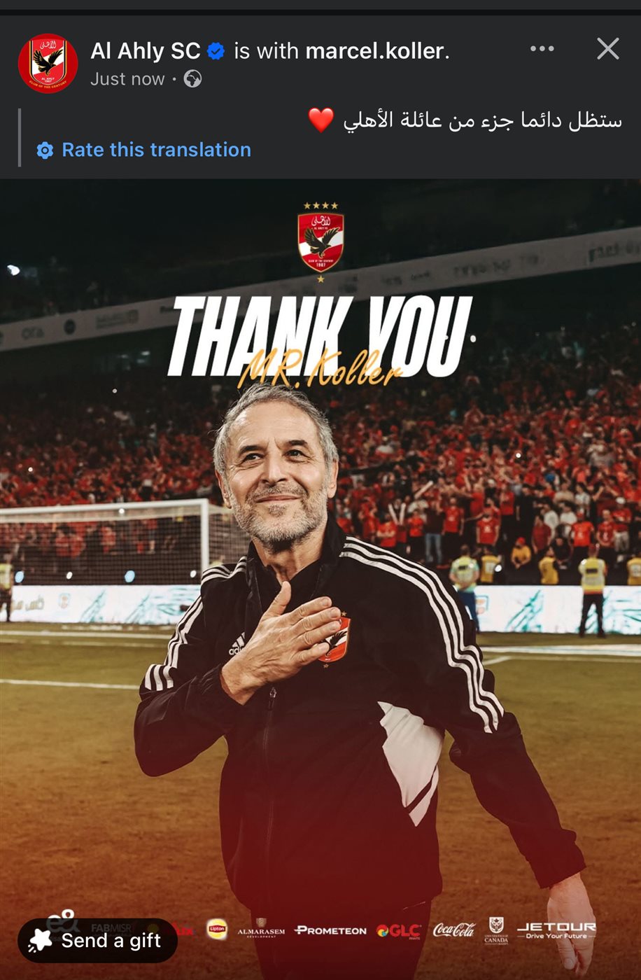 حرص الحساب الرسمي للنادي الأهلي على موقع التواصل الاجتماعي فيسبوك على توجيه رسالة لـ مارسيل كولر عقب رحيله رسميا عن تدريب القلعة الحمراء.
