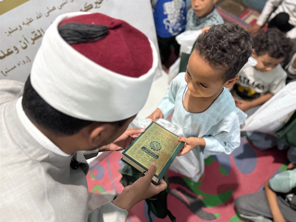 وأشار البيان إلى أن الحملة تشمل توزيع المصاحف والأدوات الكتابية والملابس والأحذية، بالإضافة إلى تقديم الحلوى للأطفال المشاركين في حلقات تحفيظ القرآن الكريم، بما يُسهِم في توفير بيئة محفِّزة تُشجّعهم على حفظ كتاب الله وتنمية وعيهم الديني والمعرفي.