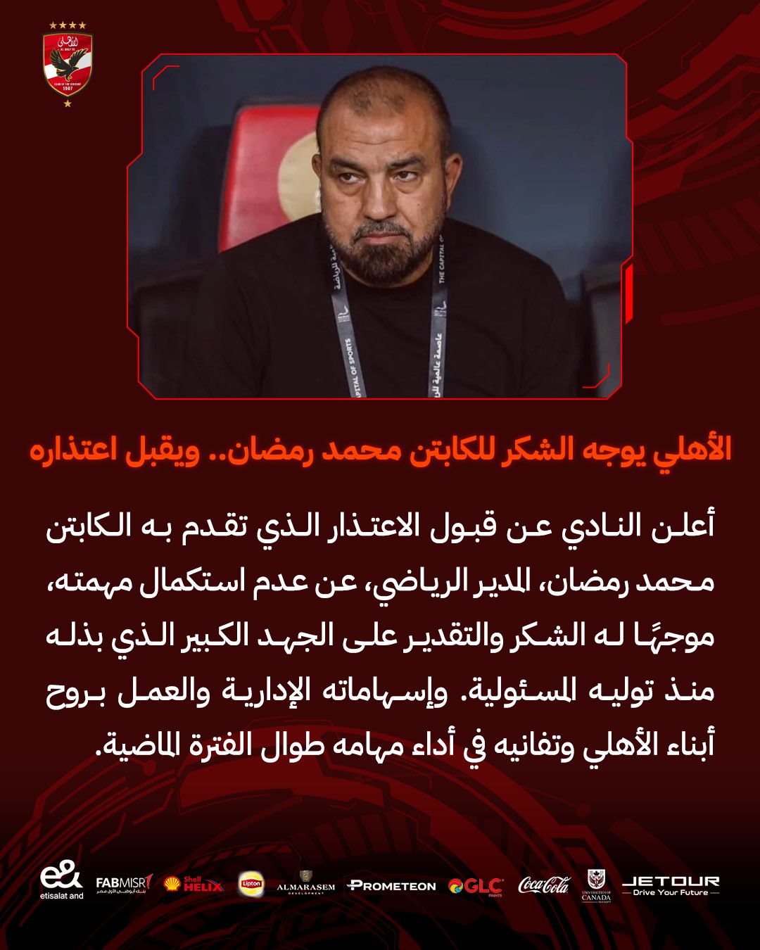 الأهلي، أعلن مسئولو النادي الأهلي برئاسة محمود الخطيب، قبول اعتذار الكابتن محمد رمضان عن عدم استكمال مهام عمله كمدير رياضي للنادي، وتوجيه الشكر له عن الفترة التي قضاها داخل جدران القلعة الحمراء.
