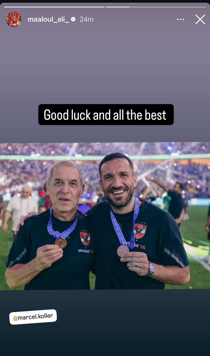 حرص التونسي علي معلول لاعب الفريق الأول لكرة القدم بالنادي الأهلي علي وداع السويسري مارسيل كولر بعد رحيله عن تدريب القلعة الحمراء.