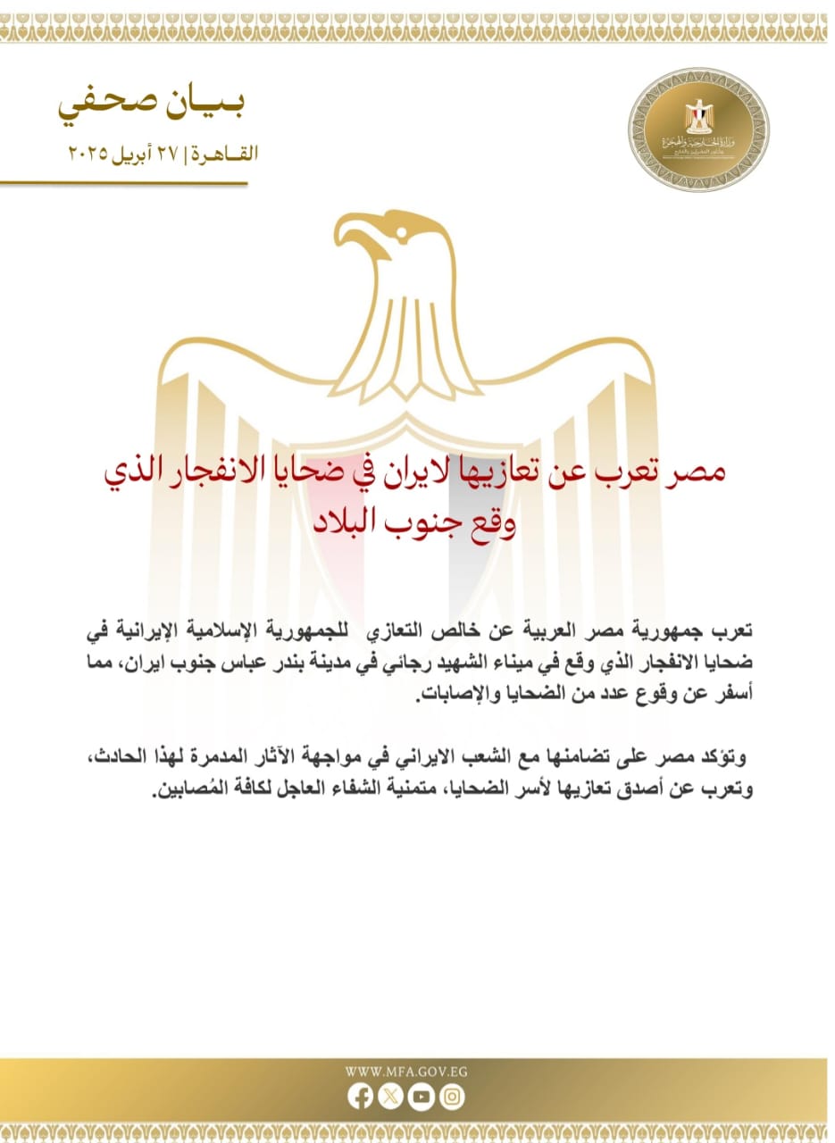 مصر تؤكد تضامنها مع الشعب الإيراني في مواجهة الآثار المدمرة للانفجار الذي وقع جنوب البلاد