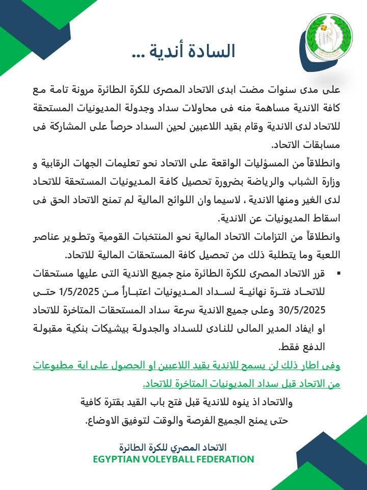 وأكد الاتحاد المصري للكرة الطائرة أنه لن يُسمح لأي نادٍ بقيد لاعبين جدد أو بالحصول على أي مطبوعات رسمية قبل سداد المديونيات المتأخرة، مشيرًا إلى أنه سيتم عقد ندوة للأندية لشرح آلية السداد وإتاحة الفرصة للجميع لإنهاء الإجراءات خلال الفترة المحددة.