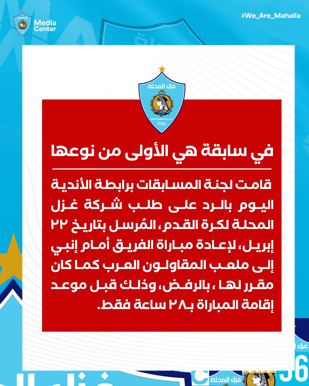 وقال غزل المحلة في بيانه " في سابقة هي الأولى من نوعها، قامت لجنة المسابقات برابطة الأندية اليوم بالرد على طلب شركة غزل المحلة لكرة القدم، المُرسل بتاريخ ٢٢ إبريل، لإعادة مباراة الفريق أمام إنبي إلى ملعب المقاولون العرب كما كان مقرر لها، بالرفض، وذلك قبل موعد إقامة المباراة بـ٢٨ ساعة فقط.