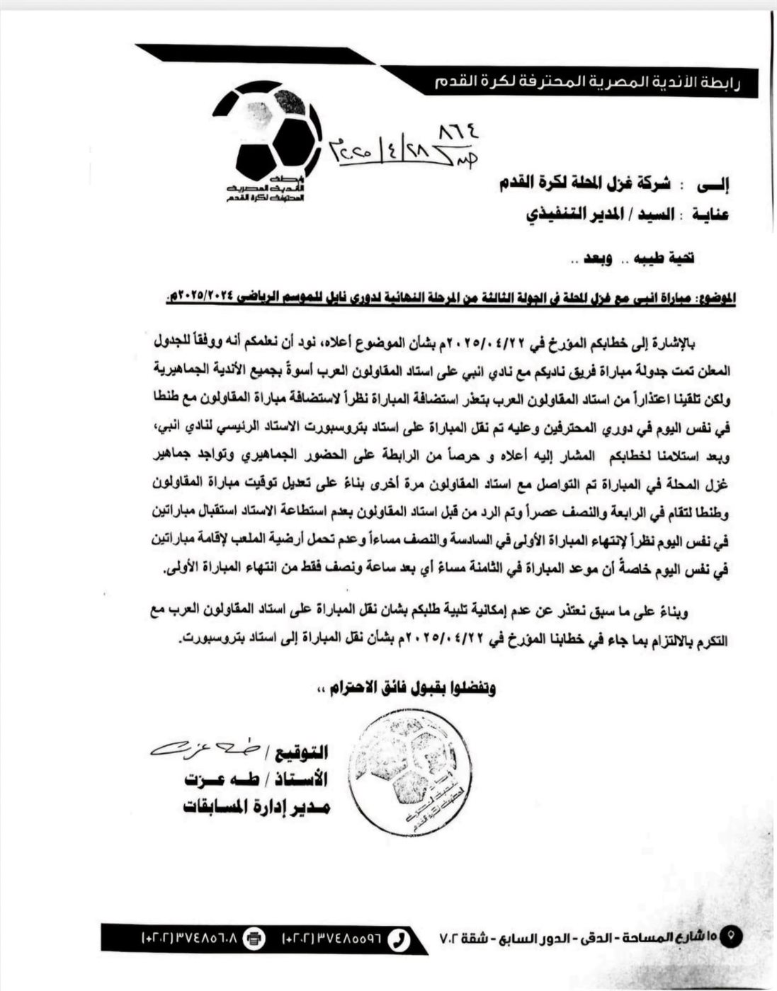 ونشر غزل المحلة خطاب رابطة الأندية للرد علي طلبه بشأن إعادة مباراة الفريق إلي ملعب المقاولون العرب، حيث أصرت الرابطة علي إقامة مباراة الفريقين علي ملعب بتروسبورت لتعذر إقامتها علي ملعب المقاولون لانشغال الملعب بمباراة الفريق بدوري المحترفين.